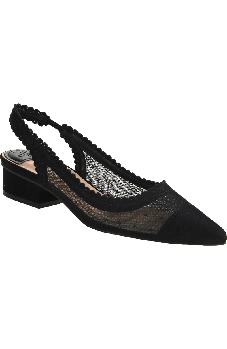 Scalloped edges add a touch of personality to a pointy-toe slingback pump that's sure to make a statement at the office and beyond.
