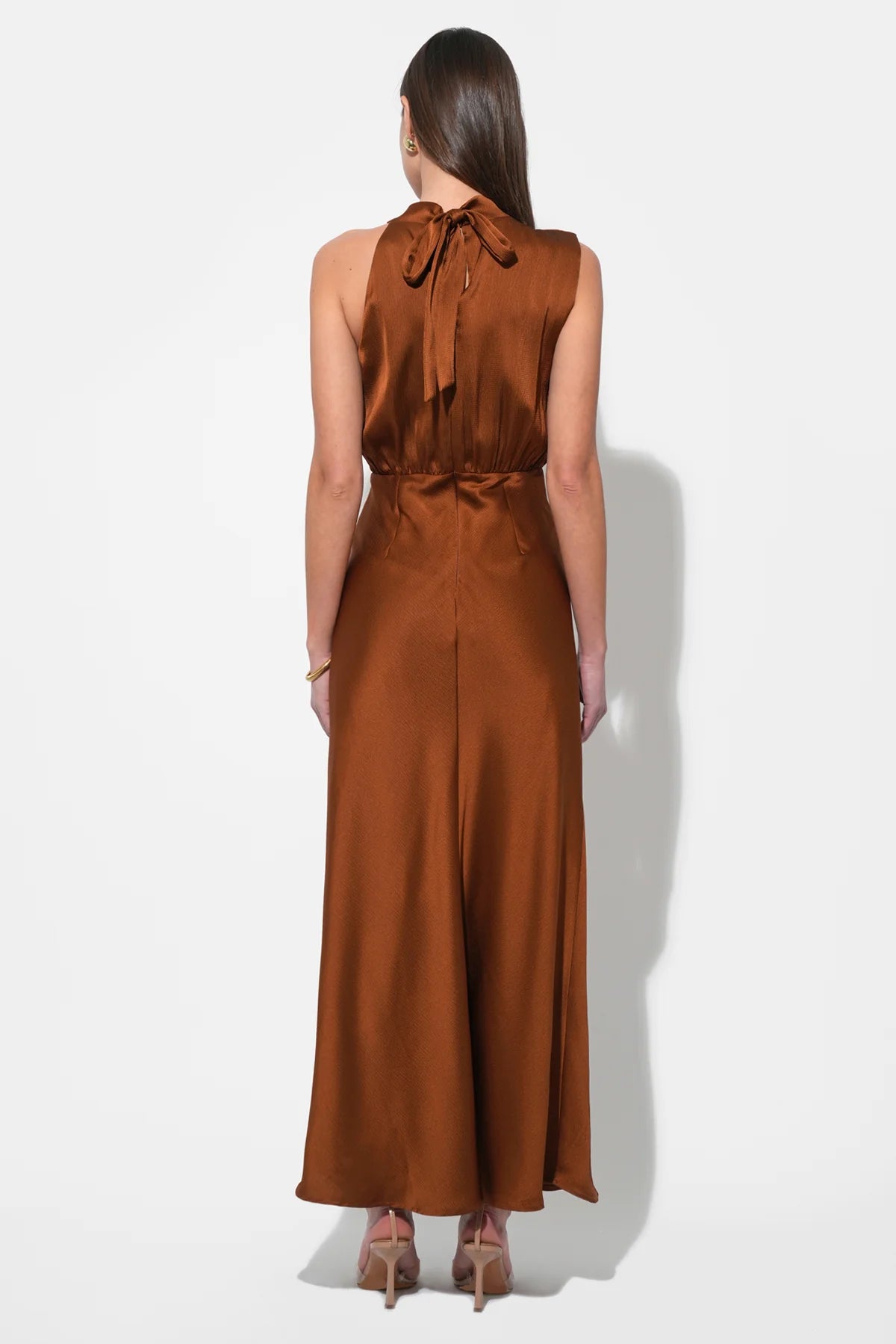 Elevate your wardrobe with the Kate Cowl Drape Asymmetrical Maxi Dress in a rich toffee hue. Its minimalist yet striking design features a luxurious cowl neckline and a sleeveless silhouette for refined elegance. The asymmetrical skirt flows gracefully, accented by a thigh-high slit that enhances movement and adds a captivating touch of drama. Perfect for occasions that call for understated sophistication with a modern twist.