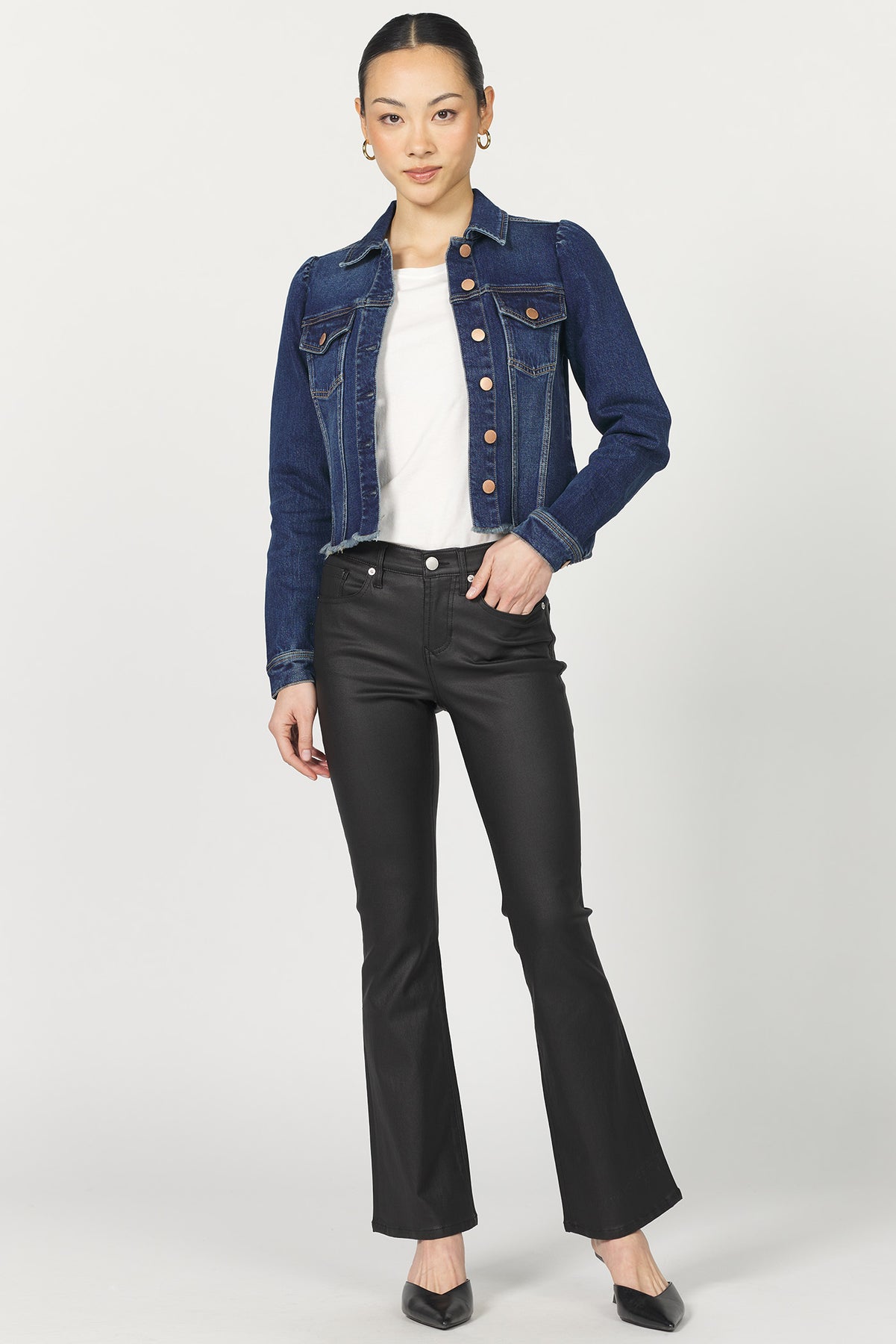 The Roselyn denim jacket features fitted puff sleeves and a frayed hem for a refined yet edgy look. Crafted from a cotton-spandex blend, it offers a comfortable stretch while maintaining structure. The button-up front adds a classic touch to this destructed design, perfect for elevating your wardrobe with subtle sophistication.