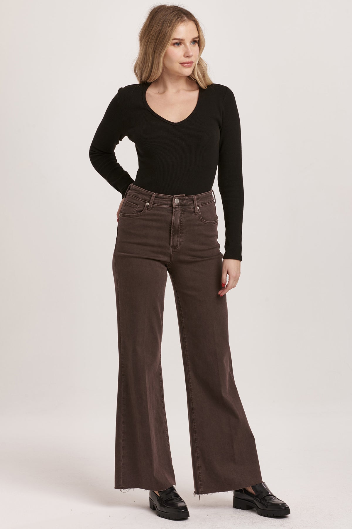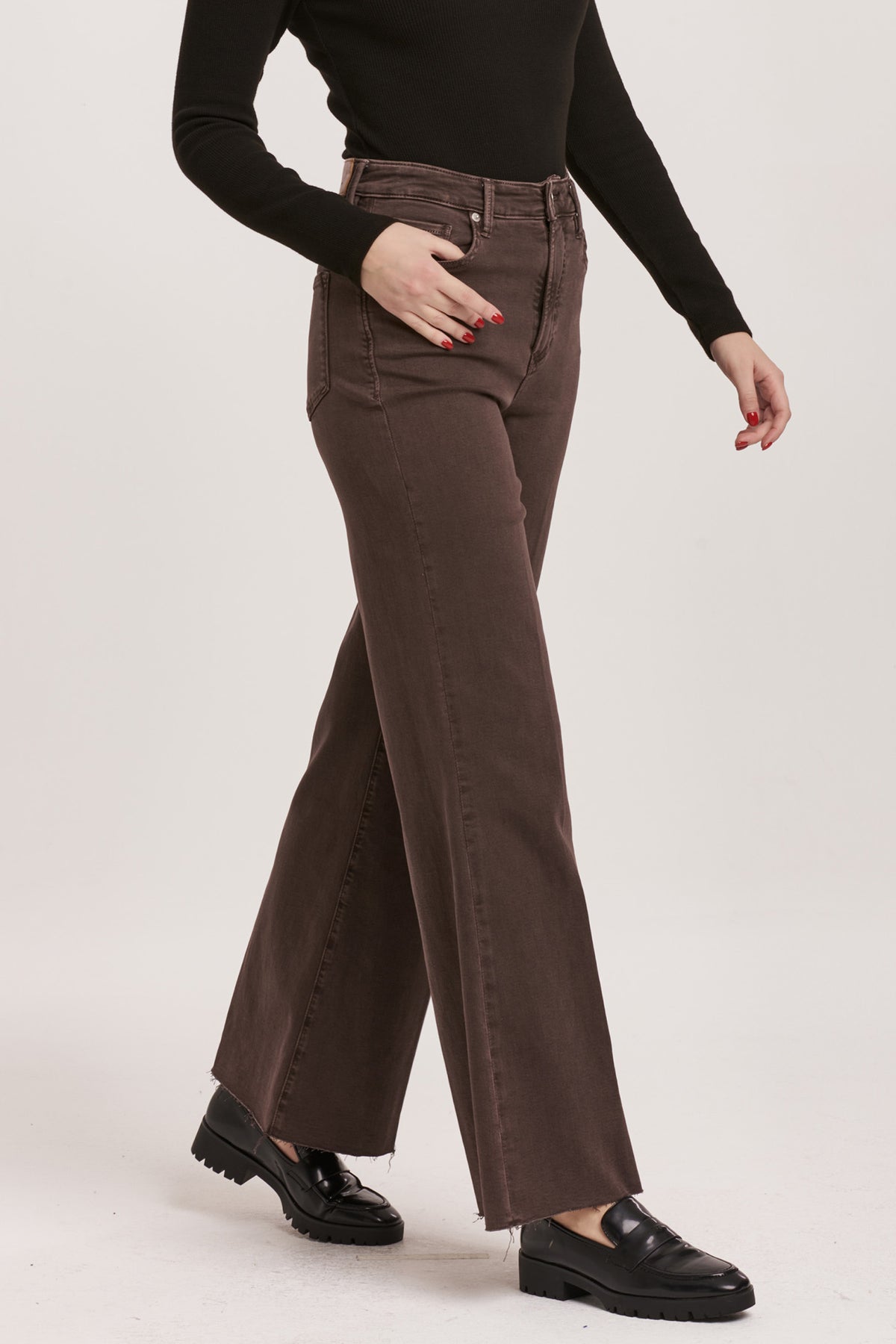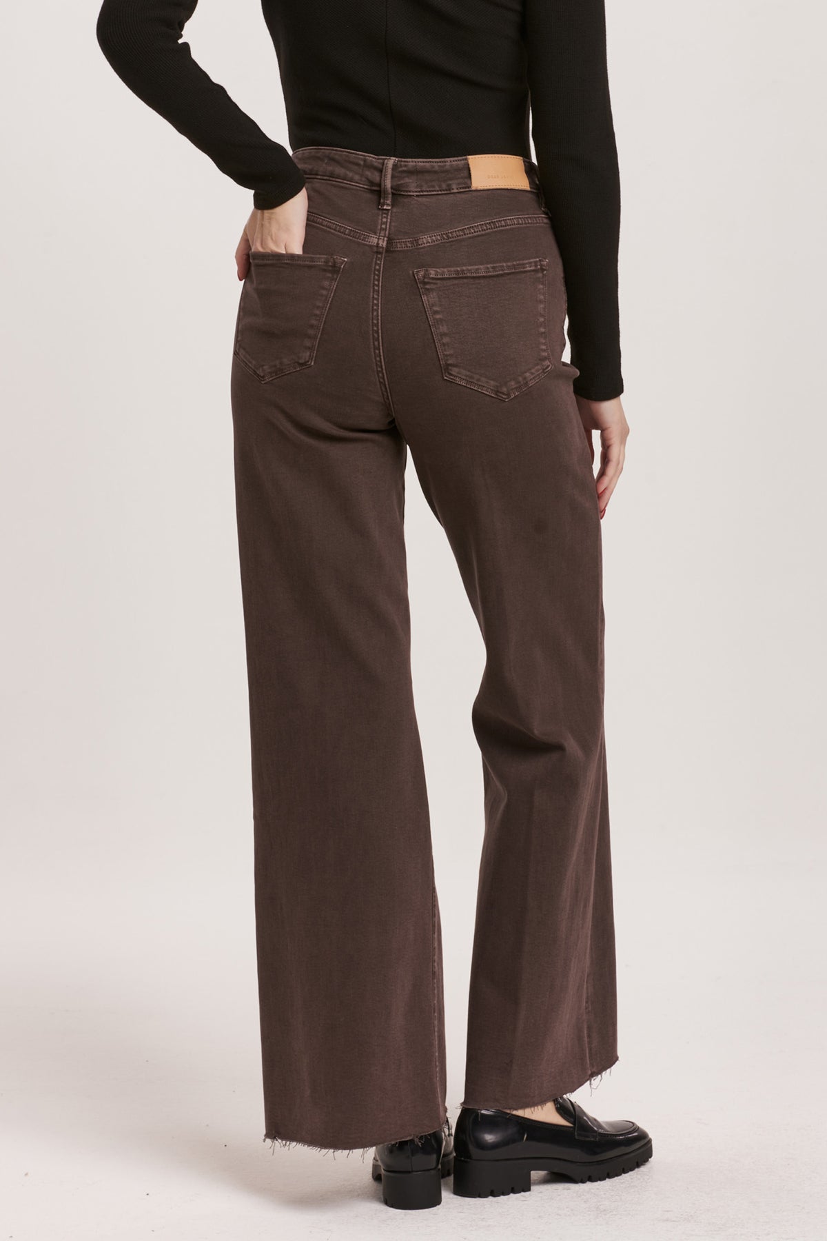 These mocha brown pants feature a wide-leg silhouette and a super high-rise fit that elongates the legs with elegant ease. The cut-off hem adds a modern, unfinished detail, blending timeless sophistication with contemporary edge. Perfect for making a refined statement in both casual and dressier looks.