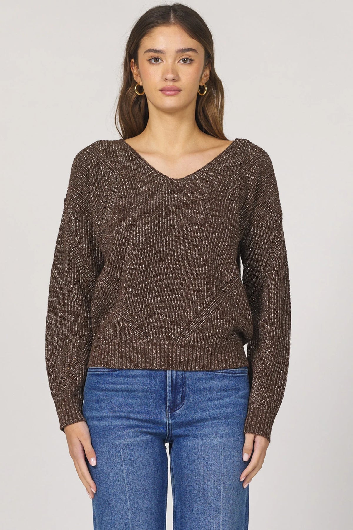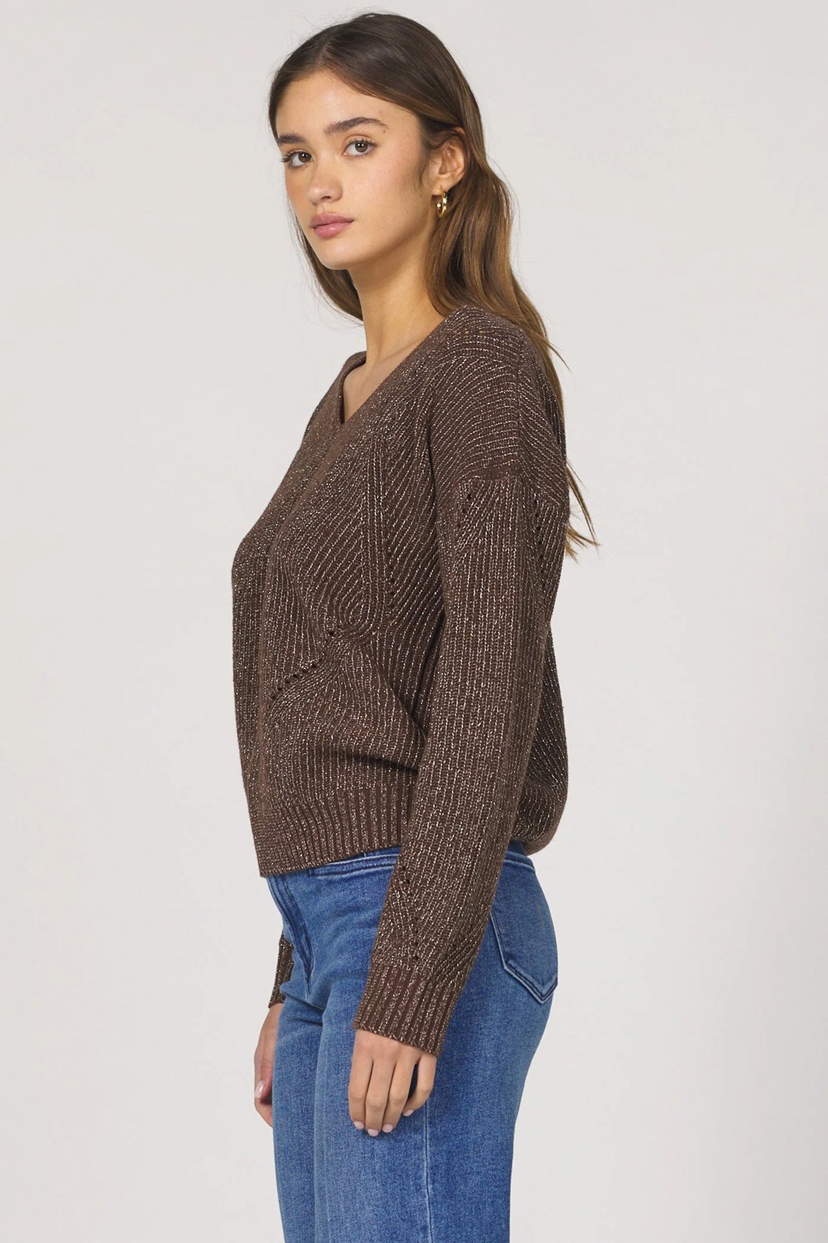 Camilla v-neck in long sleeve lurex yarn sweater, crafted from 100% cotton for a soft touch and breathable comfort.
