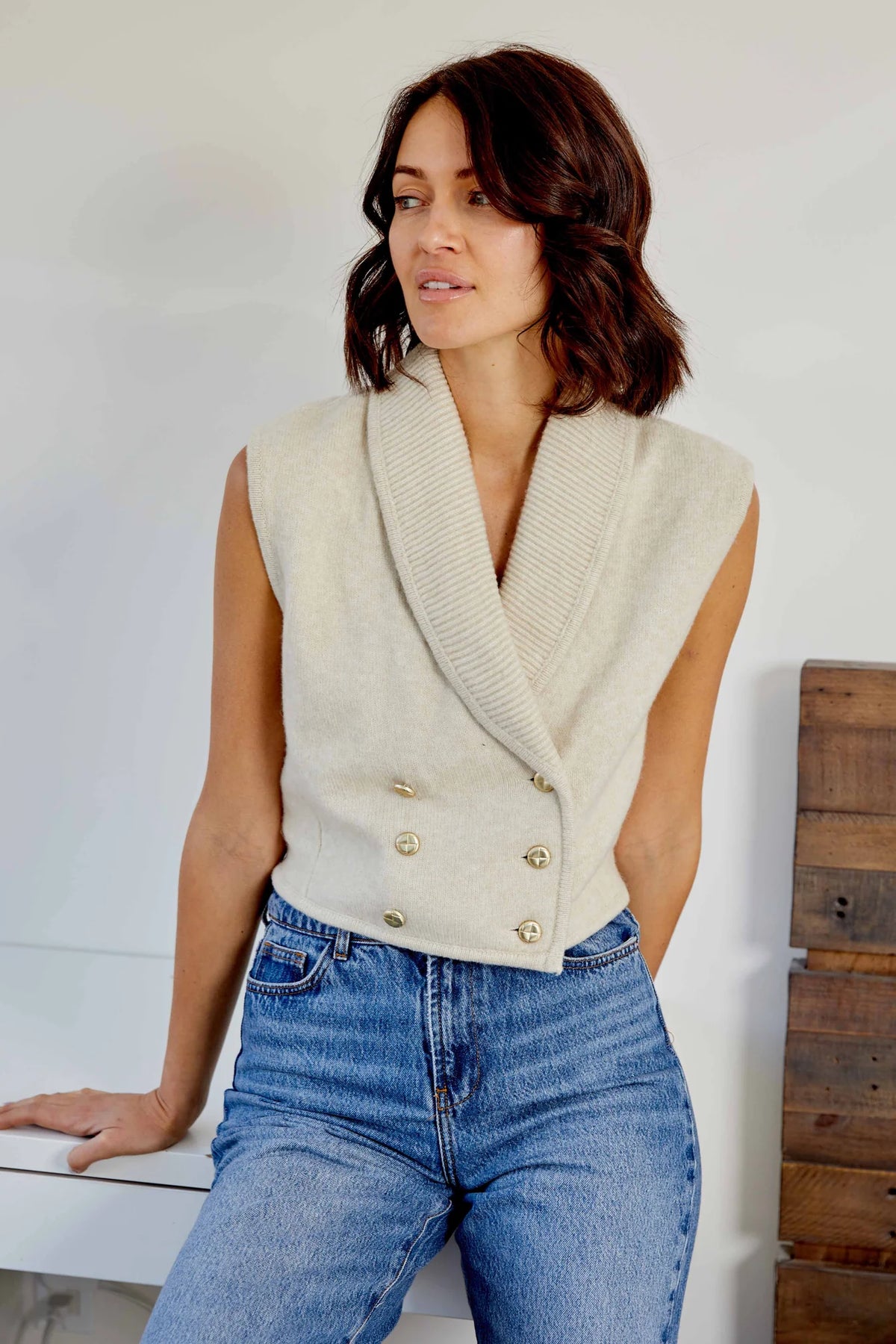 Elevate your wardrobe with the Amber Vest, crafted with a refined fisherman rib stitch shawl collar for timeless elegance. This vest combines 9% cashmere, 49% nylon, 27% wool, and 15% acrylic for a luxurious, comfortable feel. Its metal buttons feature a distinctive knot motif, adding a subtle yet sophisticated detail. Designed for easy styling and lasting wear, this piece requires dry cleaning to maintain its quality. Perfect for elevating any outfit with understated charm. Model is 5’9” and wears a US size Small.