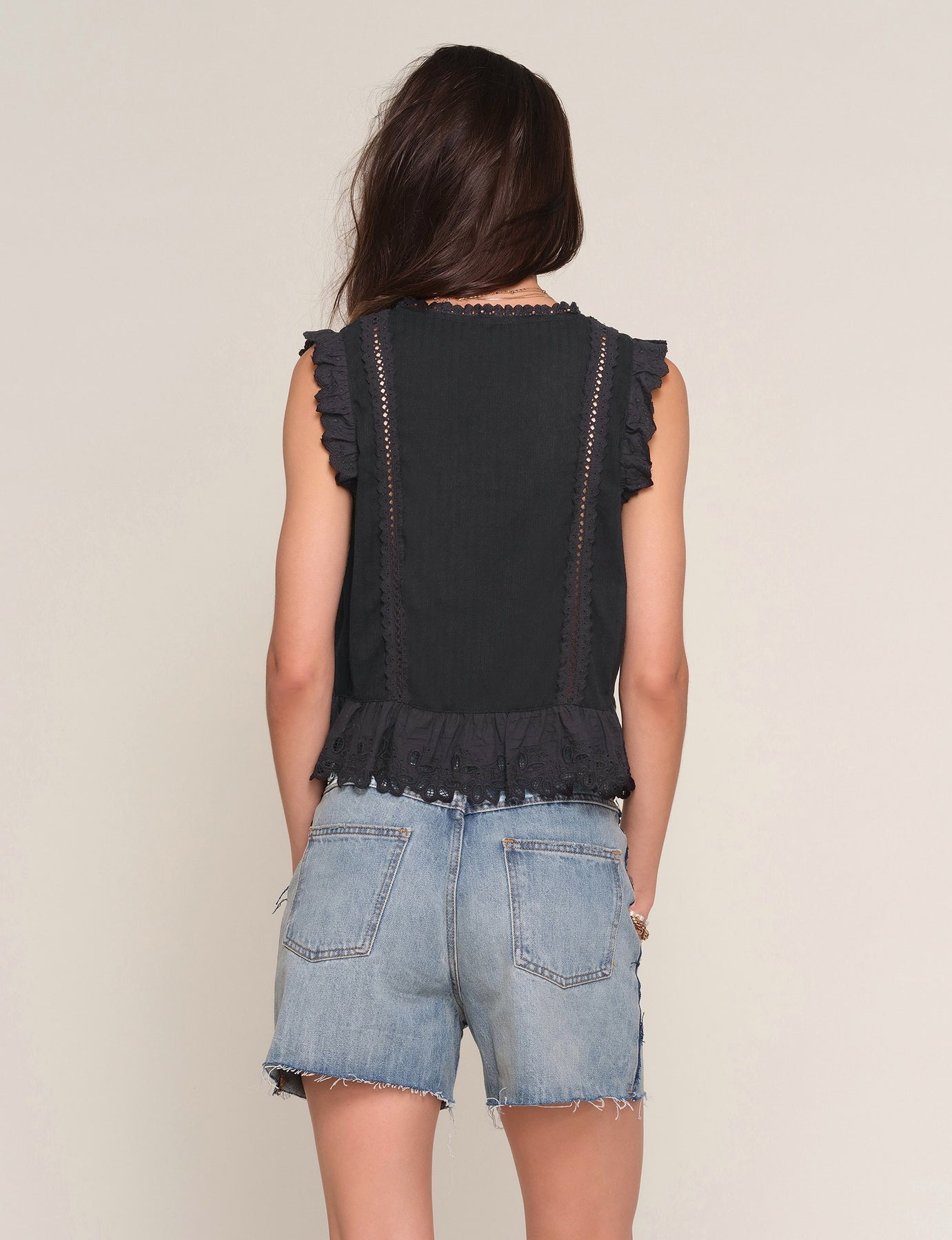 The Dia top brings understated elegance with delicate embroidery and charming ruffled details at the armholes and hem. Cut in a flattering straight fit with a classic crew neckline and button closure, this eggshell cotton essential transitions effortlessly from casual to refined. Crafted from 100% cotton and true to size, it's the perfect canvas for layering or pairing with your favorite bottoms. Gentle cycle wash to preserve its timeless appeal.