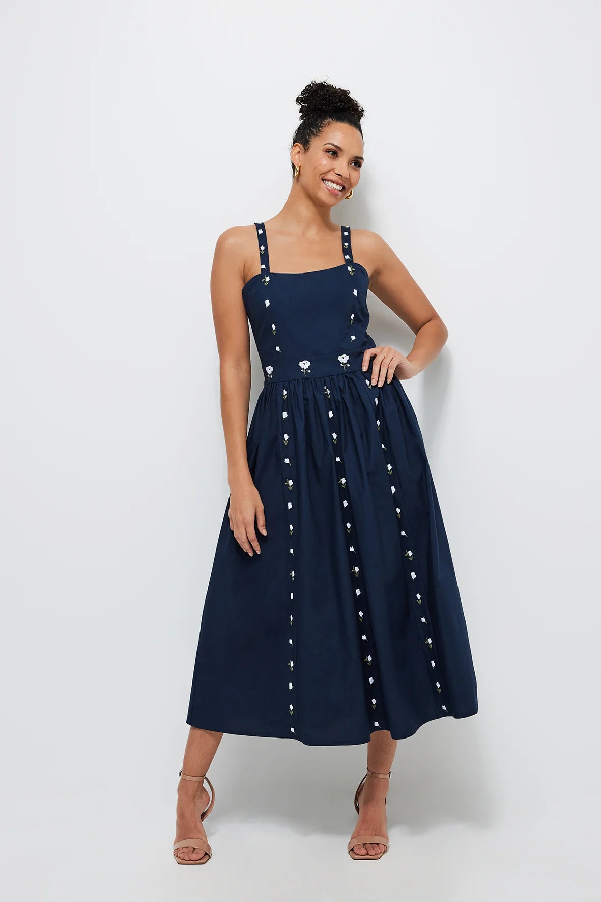 Featuring a structured square neckline and wide straps, this midi dress strikes the perfect balance between elegance and ease. Thoughtfully placed white daisy embroidery adorns the bodice, straps, and flowing skirt panels, adding a delicate, feminine charm to its timeless silhouette.
