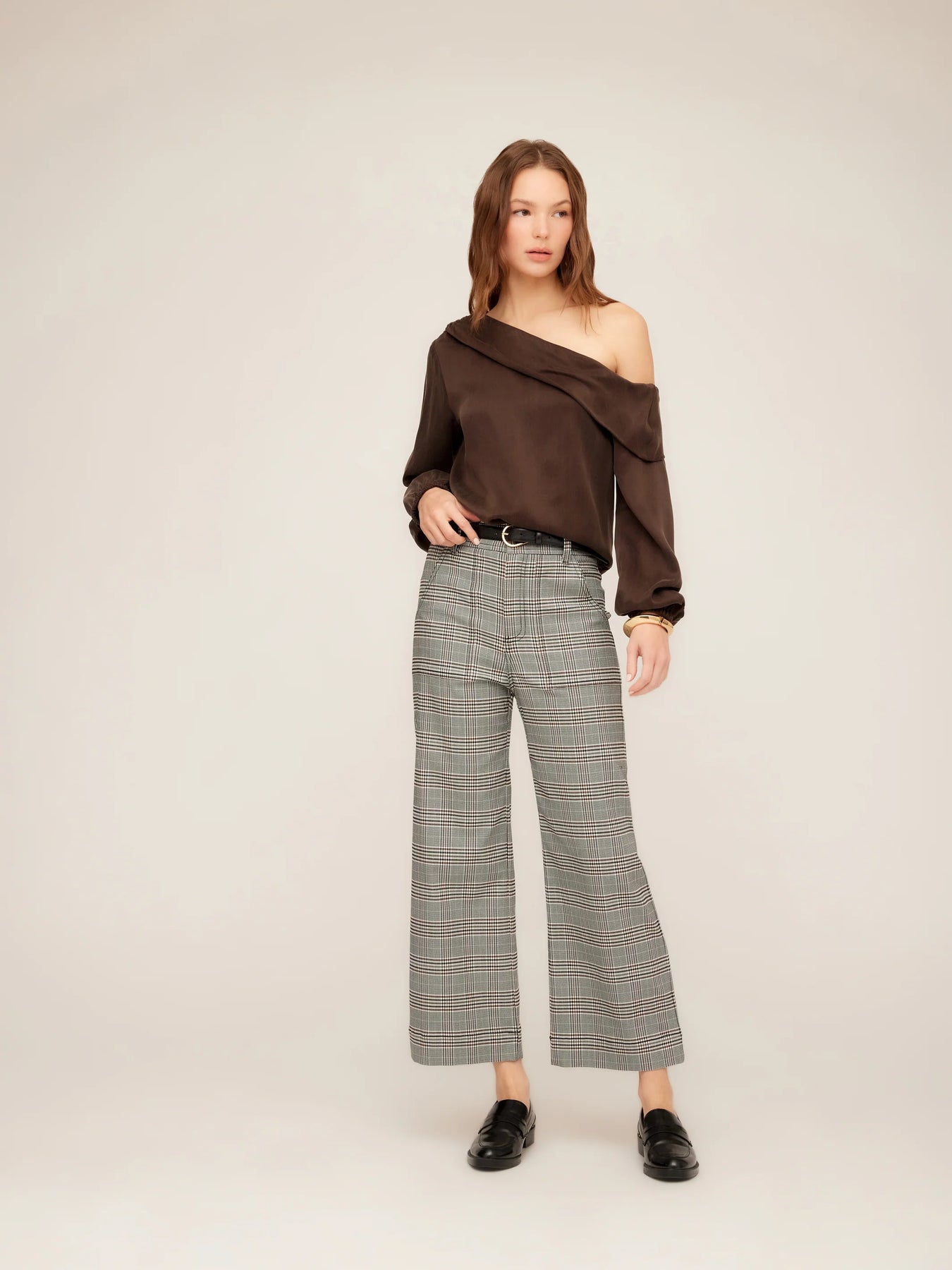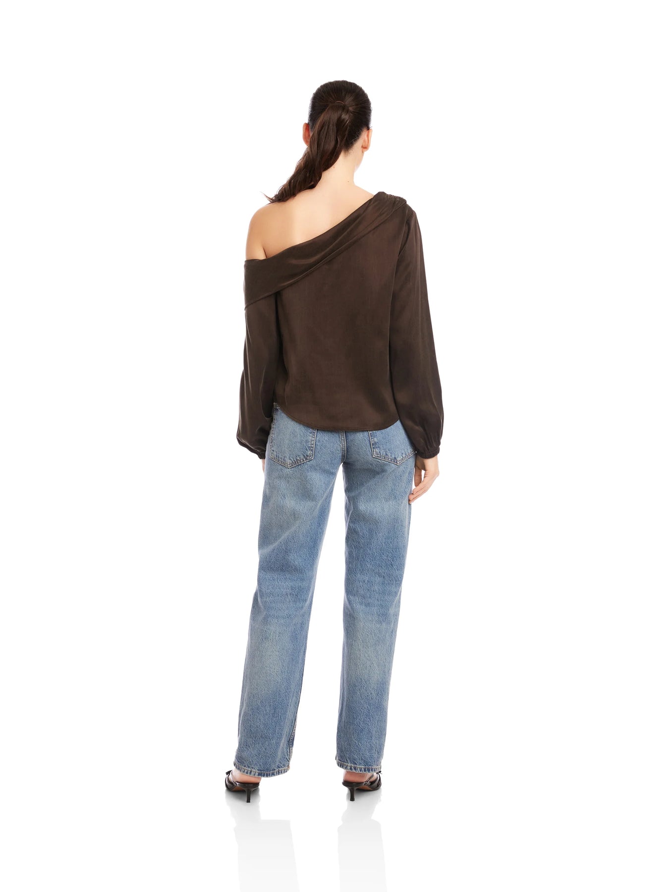 Crafted from silky cupro woven fabric, it features an asymmetric neckline that drapes off one shoulder for a striking silhouette. Flowing long sleeves with gathered cuffs add soft volume, making it the perfect blend of structured and fluid.
