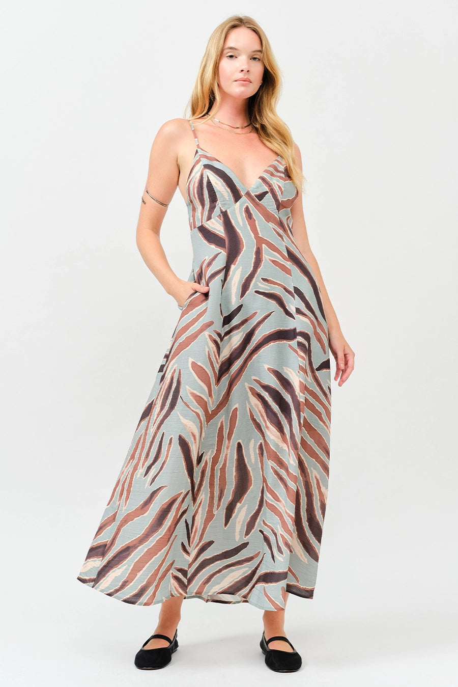 Elevate your wardrobe with this Printed Open Back Maxi Dress, featuring a sophisticated plunging V-neckline and a maxi-length silhouette. The open back design is gracefully secured with a tie adorned with tassels and a delicate coconut button closure. Sleeveless and fully lined for comfort, this dress also includes convenient side pockets, combining elegance with practicality for effortless style.