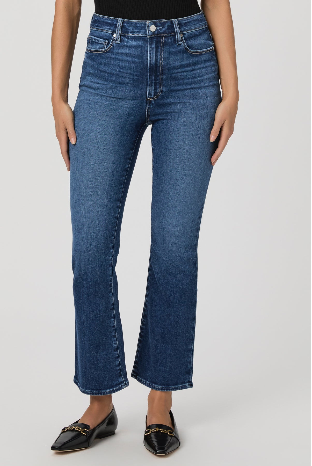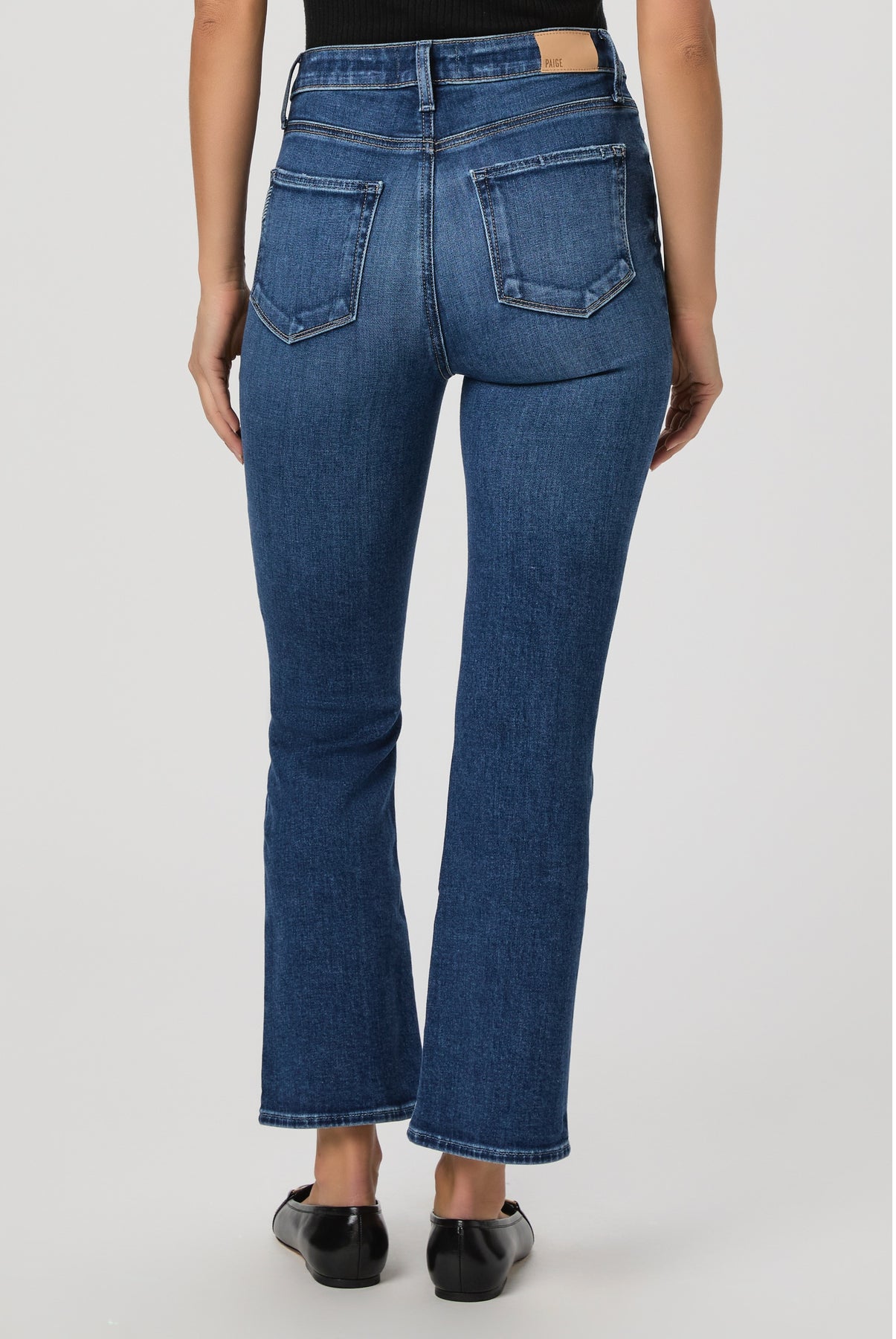 These PAIGE stretch-denim jeans are crafted from 92% cotton, 6% polyester, and 2% elastane. The jeans feature a button and zip-fly fastening, slim fit, high rise, flared leg, cropped length, structured waistband, belt loops, classic five pockets, branded hardware, faded wash and whiskering, brand patch at back waistband, and a V-shaped yoke at the back. The jeans have a rise of 10.5in / 27cm, inside leg of 28in / 71cm, and a leg opening of 16in / 41cm. They are midweight with slight stretch.