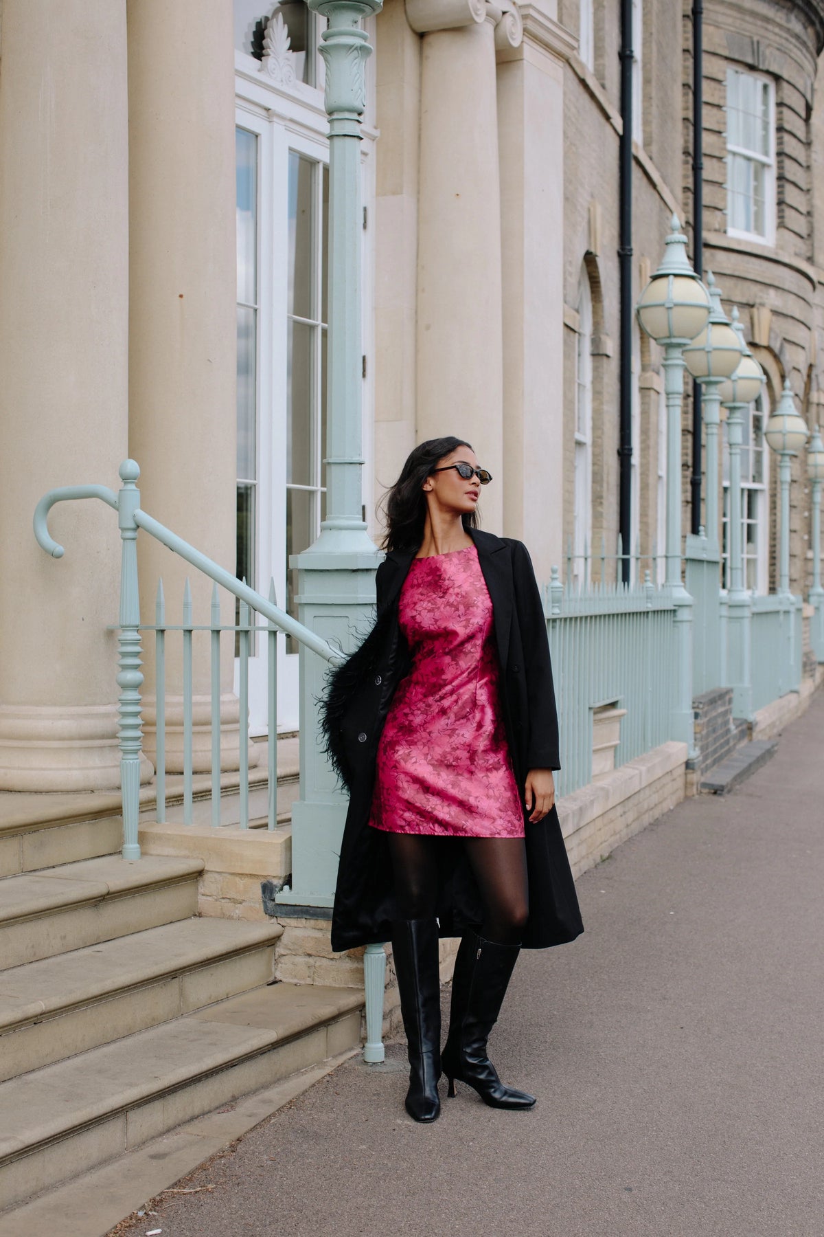 The Ren Dress features a high neckline with an elegant V-back and a discreet center back zipper. Crafted from luxurious shantung fabric and fully lined for comfort, this mini dress includes convenient pockets and a striking pattern that elevates your style for any cocktail occasion. Designed to blend sophistication with playful charm, it requires dry cleaning to maintain its pristine quality.