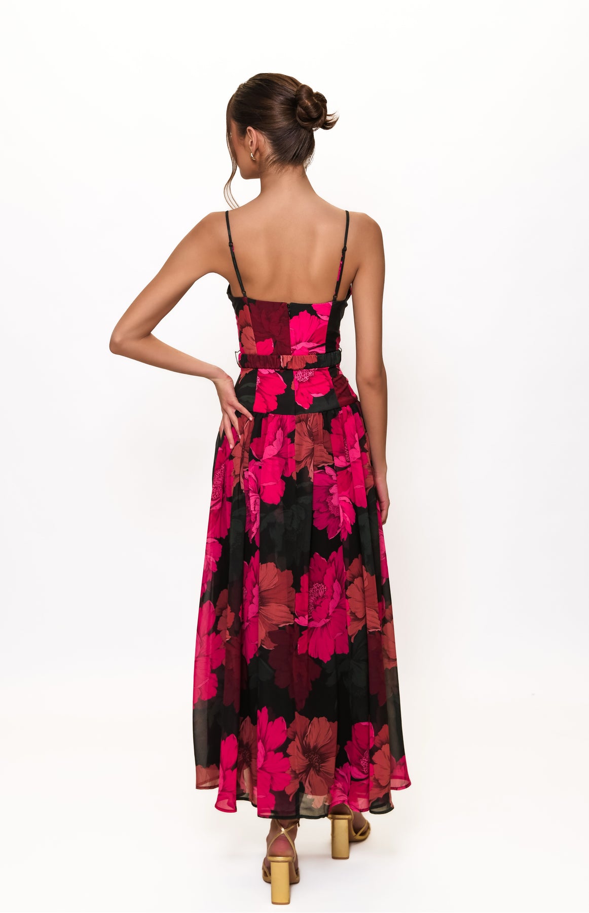 Elevate your formal wardrobe with the Ruby Dress, a colorful tank V-neck midi featuring a floral design. This bustier-style dress is tailored with a belted waist for a flattering silhouette, combining sophistication with a chic edge perfect for special occasions.