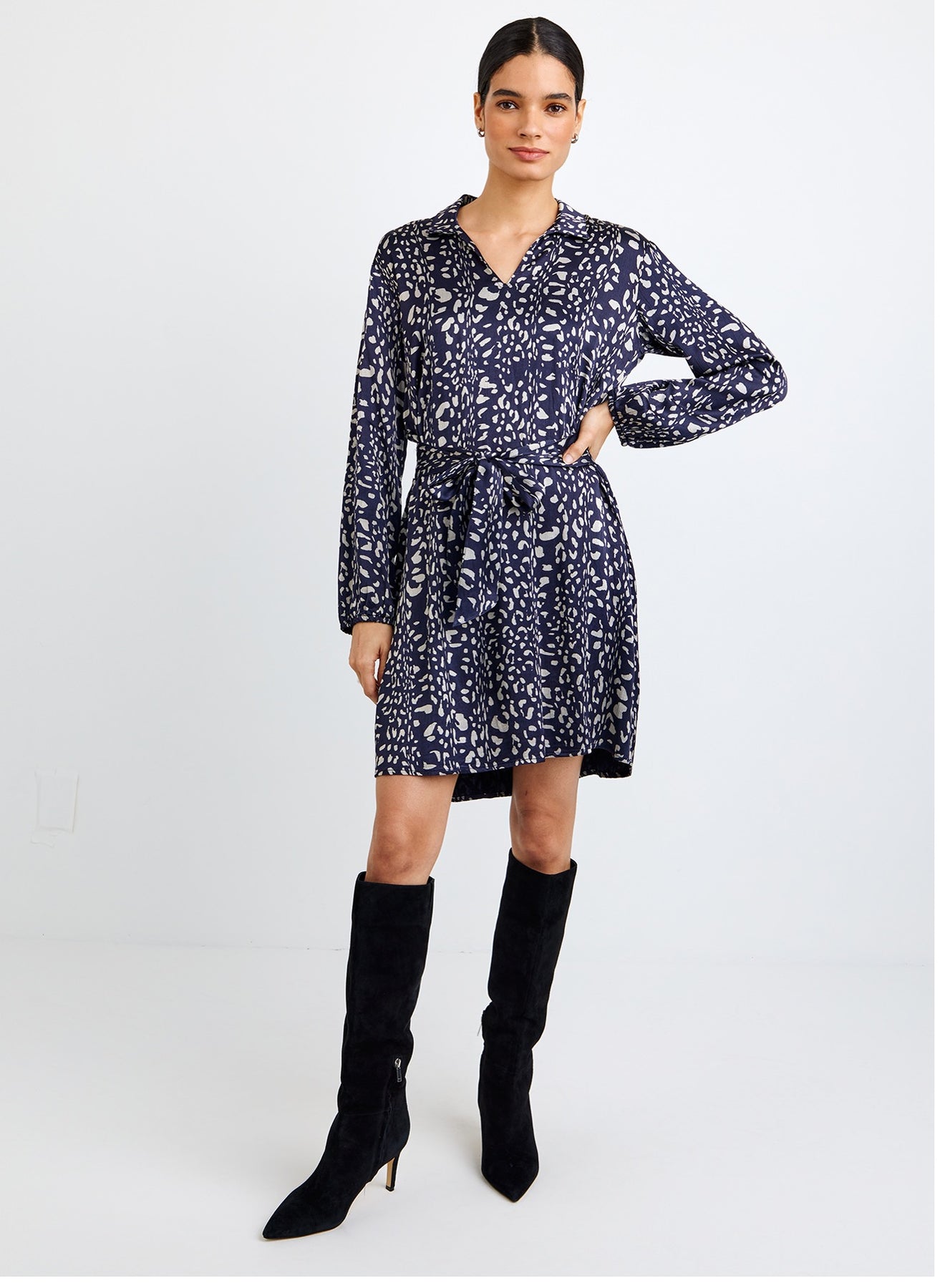Experience refined elegance with this silky tunic mini dress featuring a collared V-neck and long sleeves. The delicate printed fabric flows gracefully, while the elastic tie waist offers a tailored fit that enhances your silhouette. This versatile piece effortlessly combines comfort and sophistication, making it an ideal choice for both casual and dressy occasions.