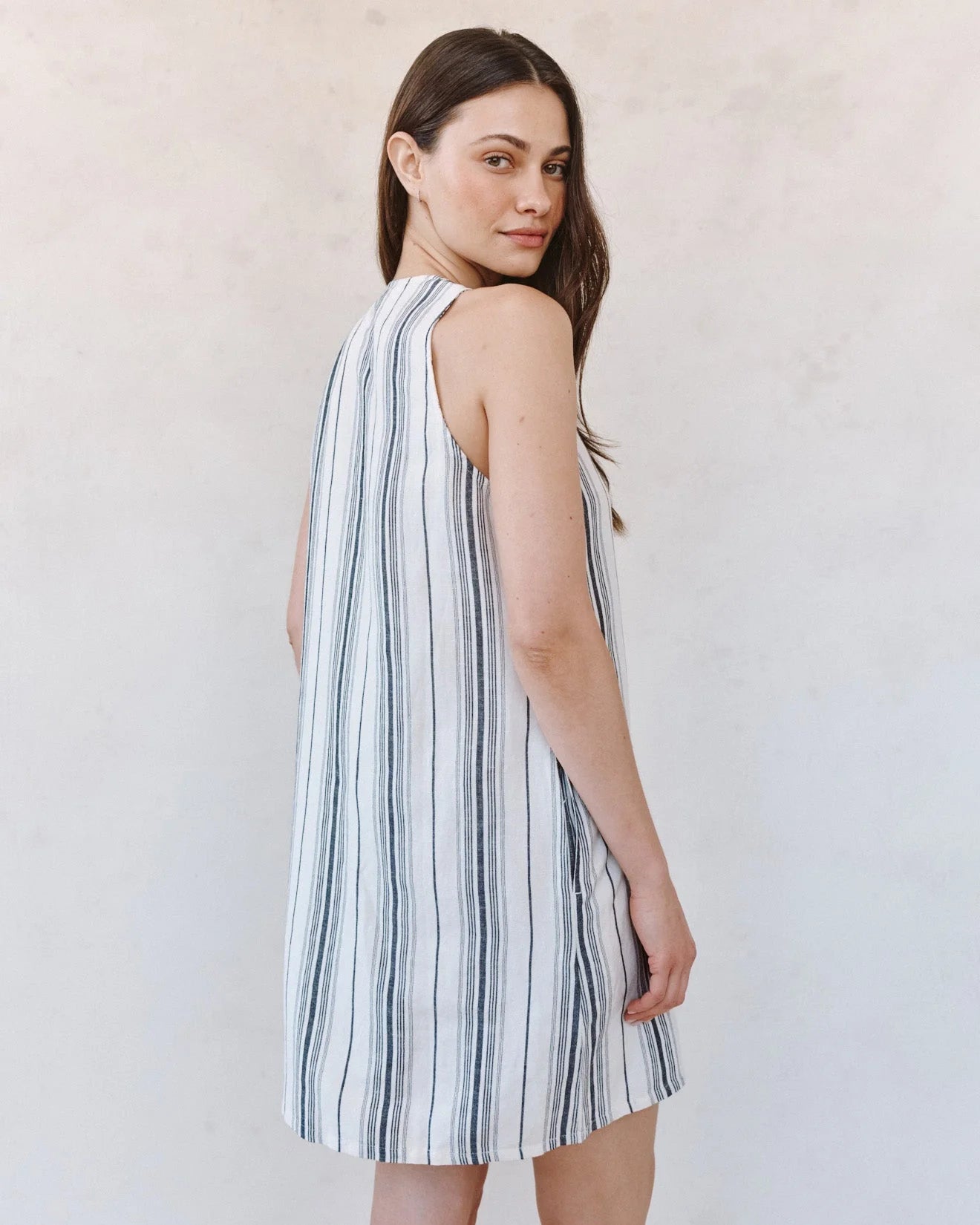 The Sleeveless Lace Up Mini Dress brings playful detail to a breezy mini silhouette. A lace-up neckline with tassel ties adds a hand-touched finish, while side pockets and a relaxed fit keep it functional.