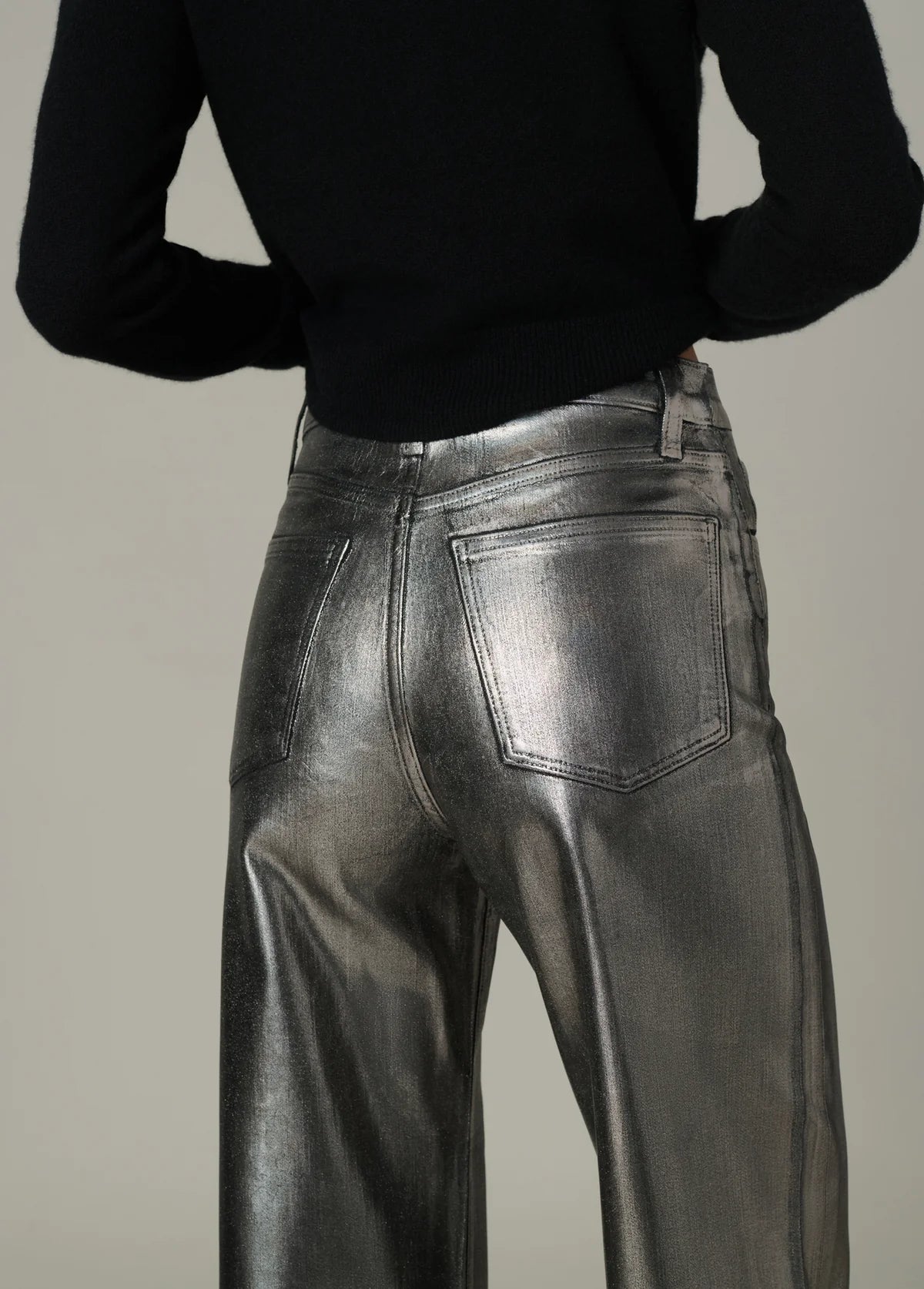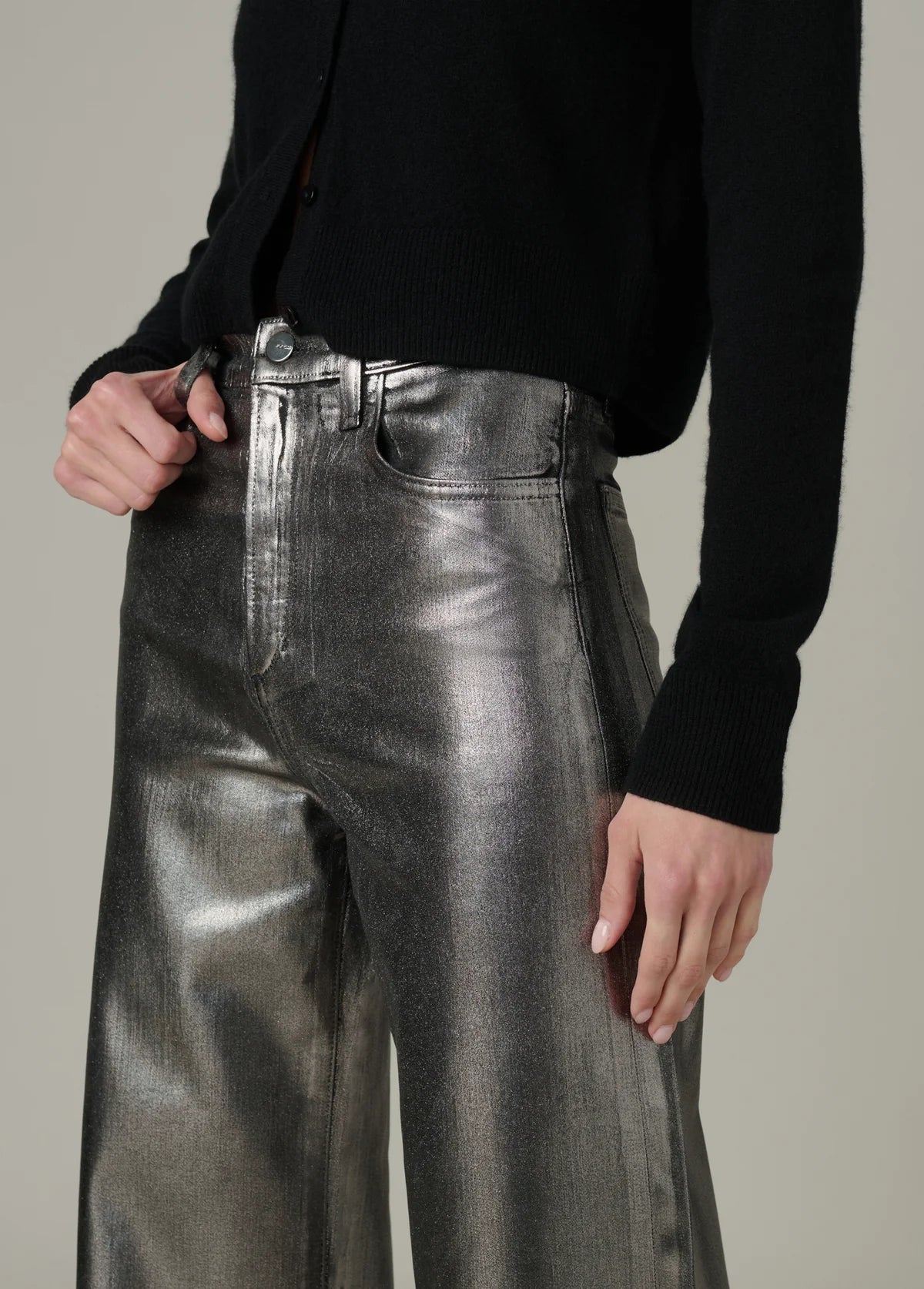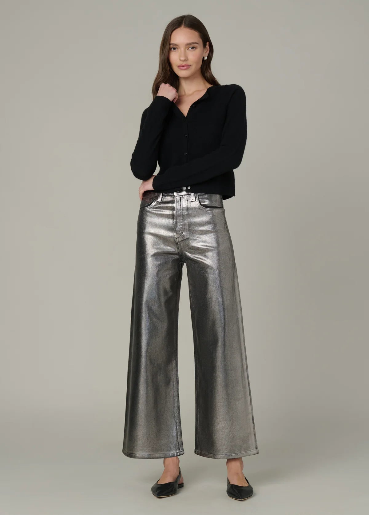 The Mia Wide Leg Ankle Foil offers a sophisticated silhouette with its high-rise waist that fits smoothly through the hips and flows into a wide leg, ending elegantly at the ankle. Featuring a zip fly and classic five-pocket styling, this 28" inseam design combines timeless detail with modern appeal, perfect for a polished yet effortless look.