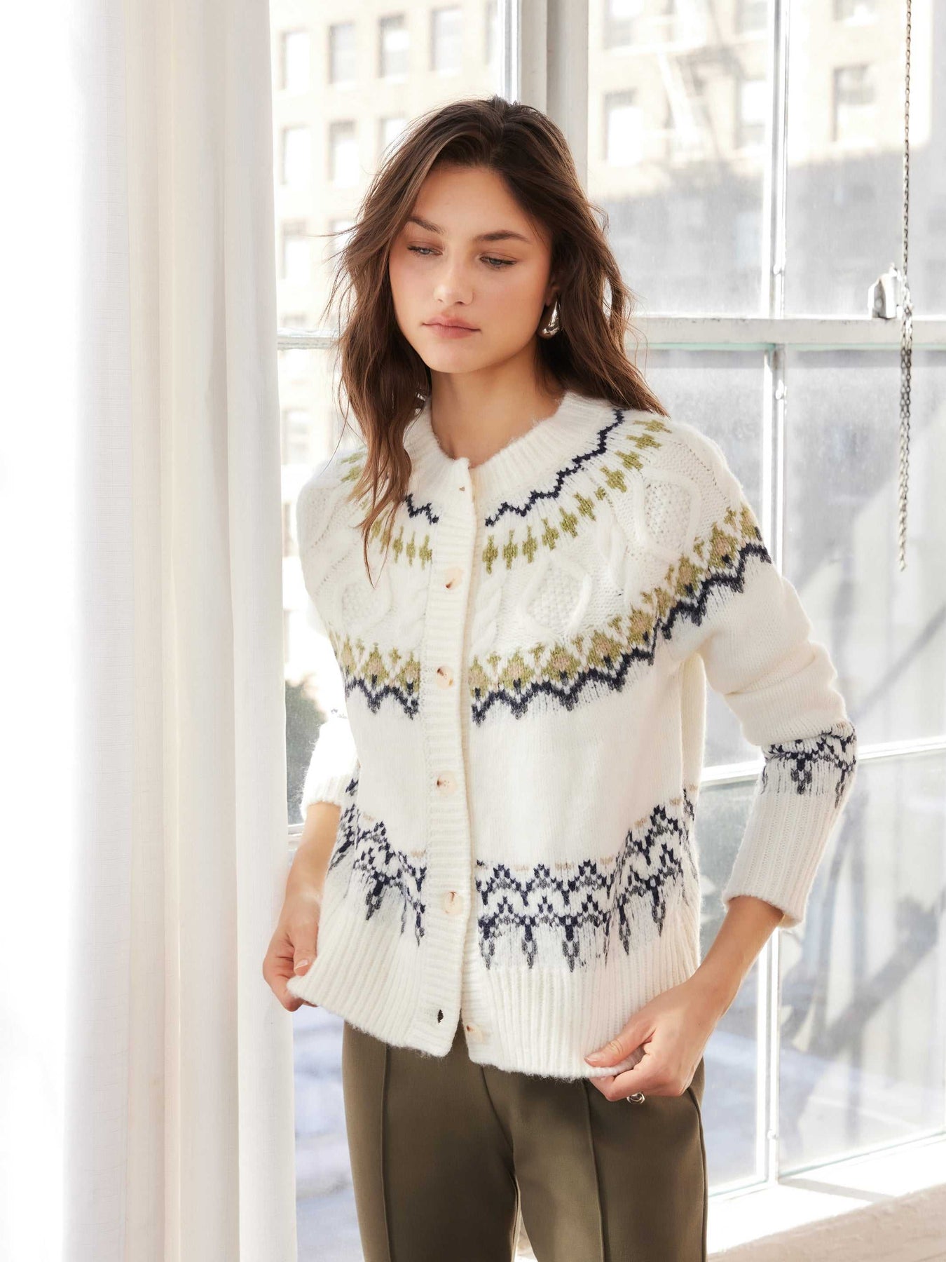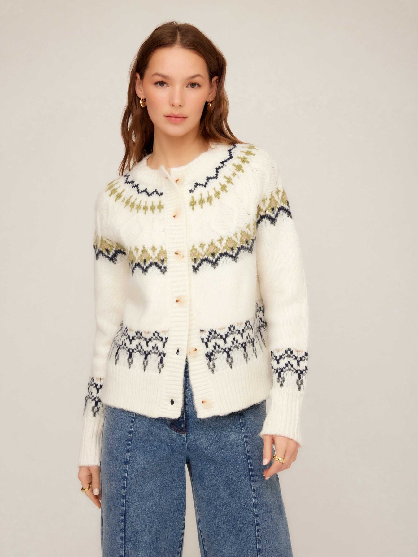 Featuring a classic Fair Isle pattern, this cardigan is knit from a soft, midweight blend with minimal wool content for lightweight warmth and comfort. Designed with long sleeves, wide-edge ribbed detailing, and a front button closure, it offers a polished, heritage-inspired look.