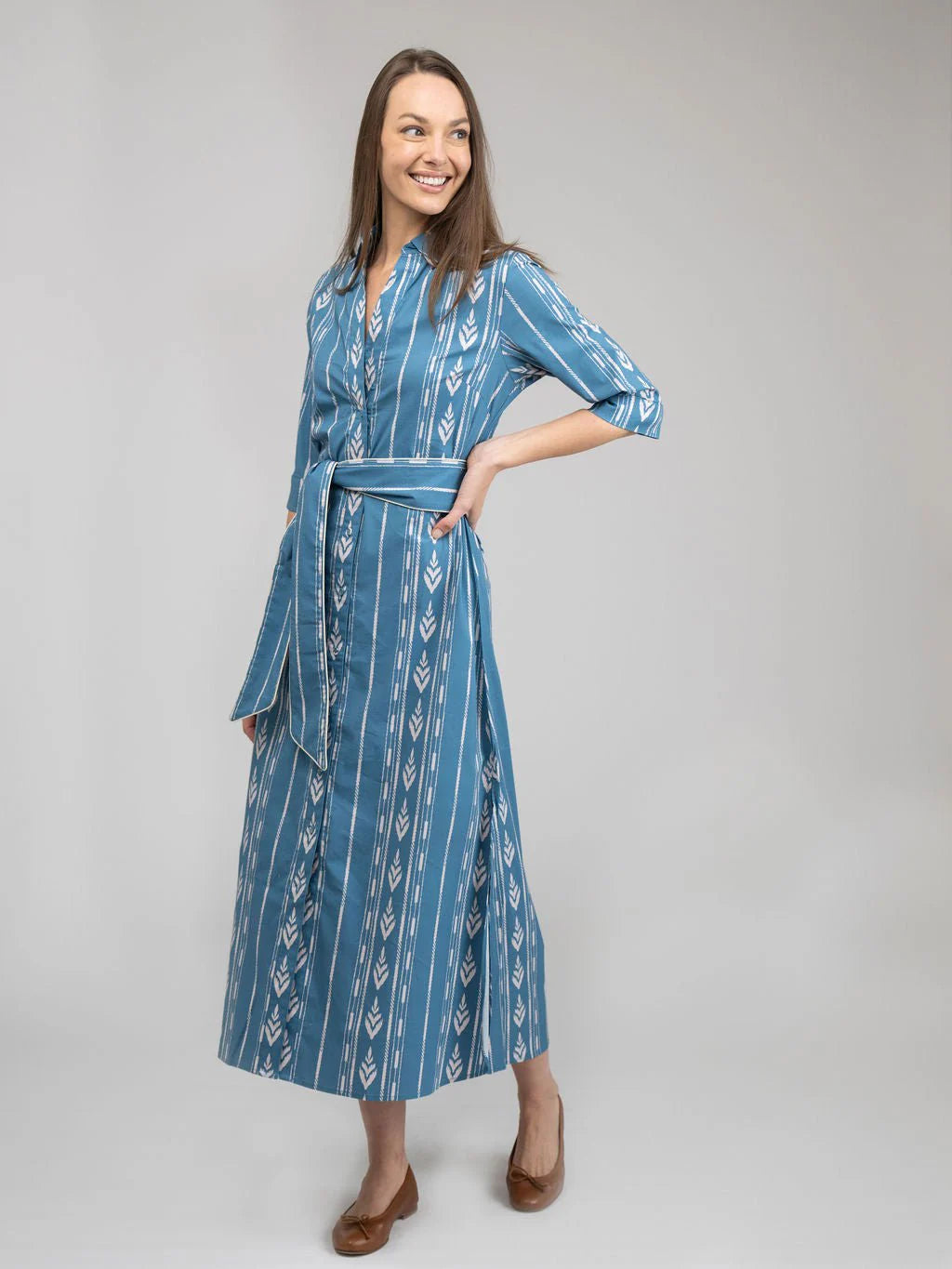 Effortlessly elevate your style with The Eloise Dress. The classic design includes a button up bodice, quarter length sleeves, and an optional tie waist for a timeless silhouette. Featured in our new Blue Ikat Stripe print. Perfect for everyday wear.