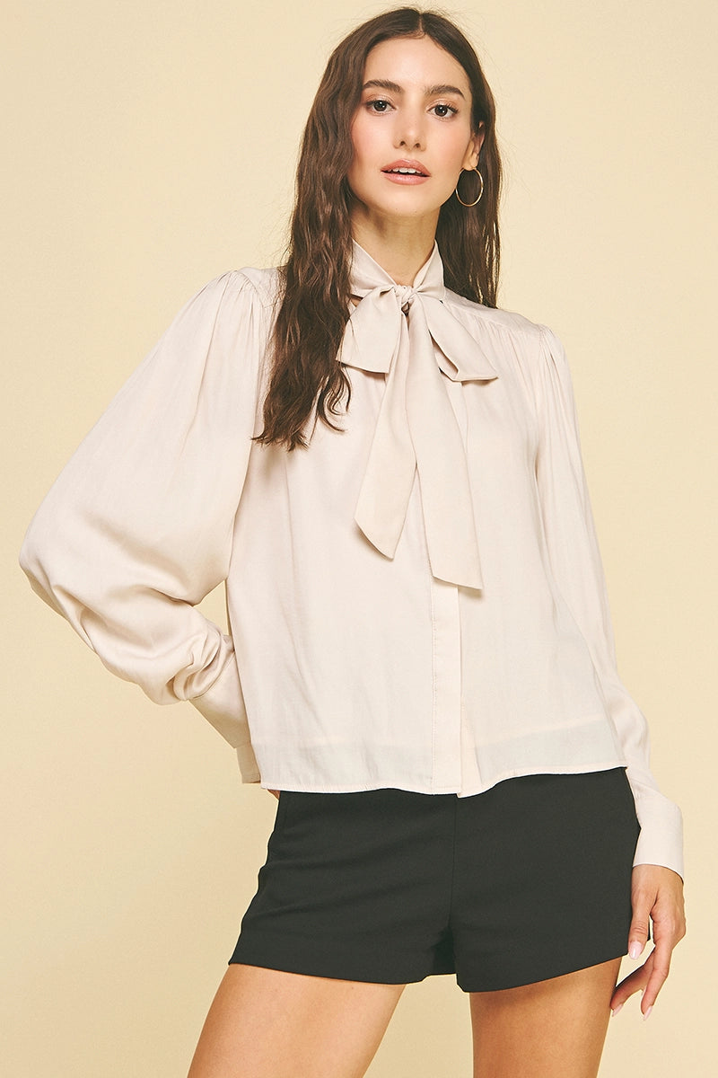 Elevate your wardrobe with this button-down shirt featuring a self-tie neck for a refined, adjustable look. The long sleeves and subtle shirring detail add dimension and elegance, making it an ideal choice for both professional settings and sophisticated casual wear. Designed for a flattering fit, this piece seamlessly blends classic tailoring with modern touches.