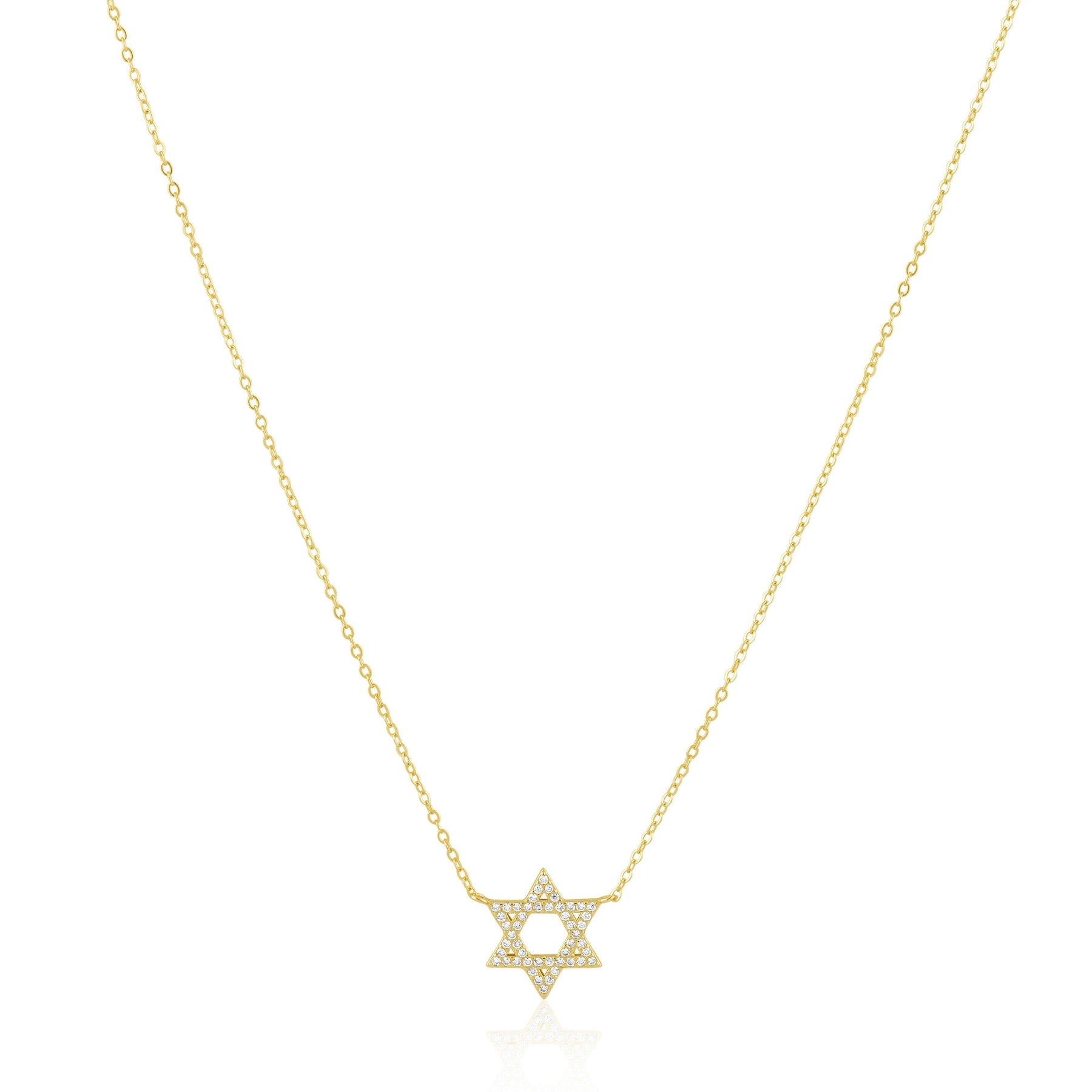 This Classic Star of David Necklace features a suspended pave Star of David design, perfect for adding a touch of elegance to any outfit. Embrace your faith with this beautifully crafted necklace.