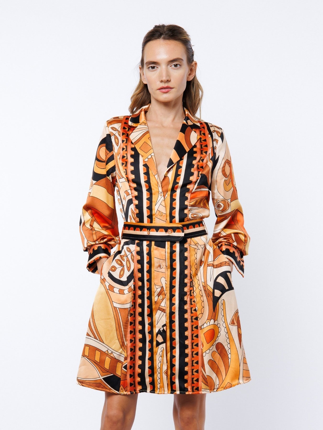 Effortless elegance meets statement style in this printed mini dress with pockets. The low V-neckline and collared silhouette create a refined, layered look, while the bold print commands attention. Long sleeves provide coverage and sophistication, and the included waist belt cinches the silhouette for a flattering, defined shape. Perfect for transitional dressing—wear it solo or layer it for versatility.