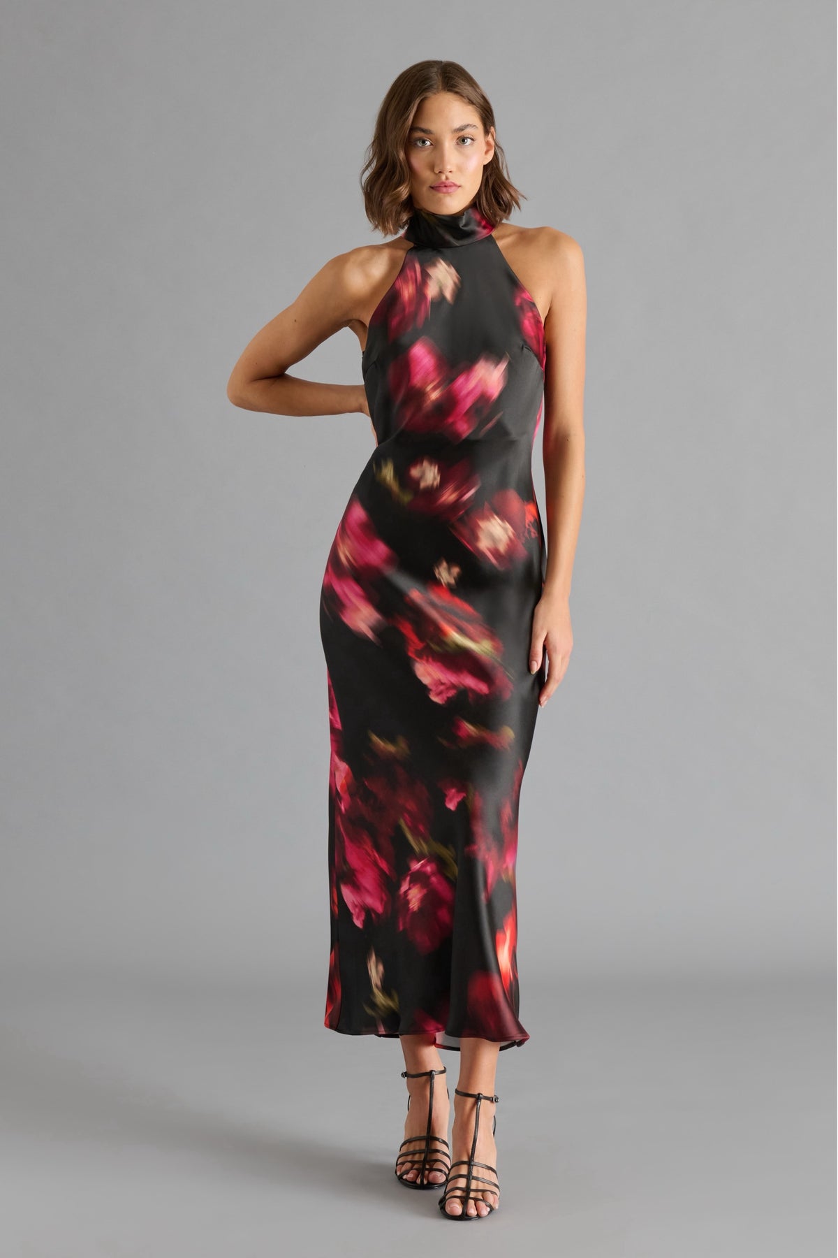 The Lara Dress commands attention with its architectural cutaway shoulders and high neckline, crafted from lustrous polyester that drapes with effortless elegance. A bias-cut silhouette creates graceful movement through the 58½" length, while the hidden back zip and keyhole tie closure add refined detail. Lined for comfort and designed for easy care—machine wash and tumble dry. A statement piece for those who embrace understated glamour.