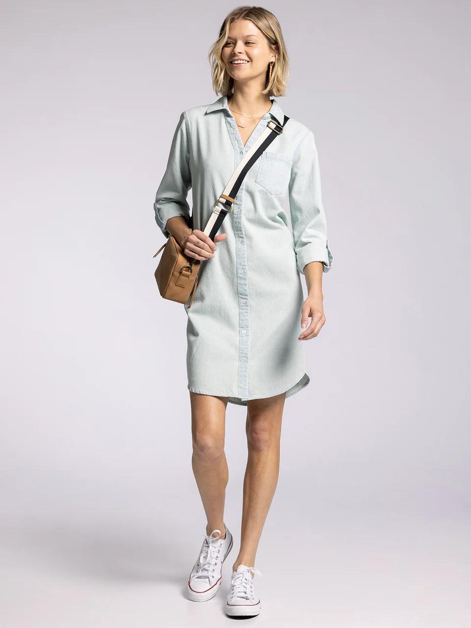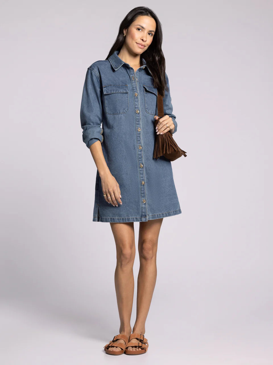 STRETCH DENIM DRESS WITH BRAIDED BELT DETAIL