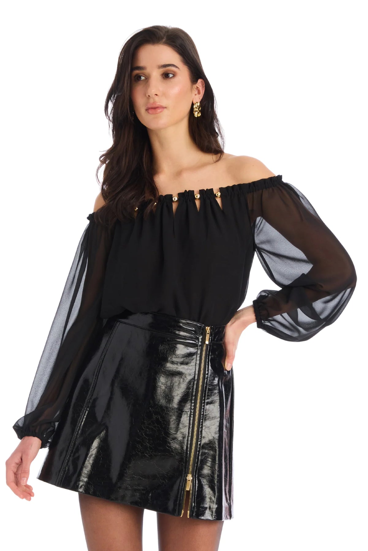 • Fit: Everyone loved our faux mini skirts last fall, so we brought back some new and exciting versions! Shiny faux leather with a two-way gold zipper at the center leg placement.