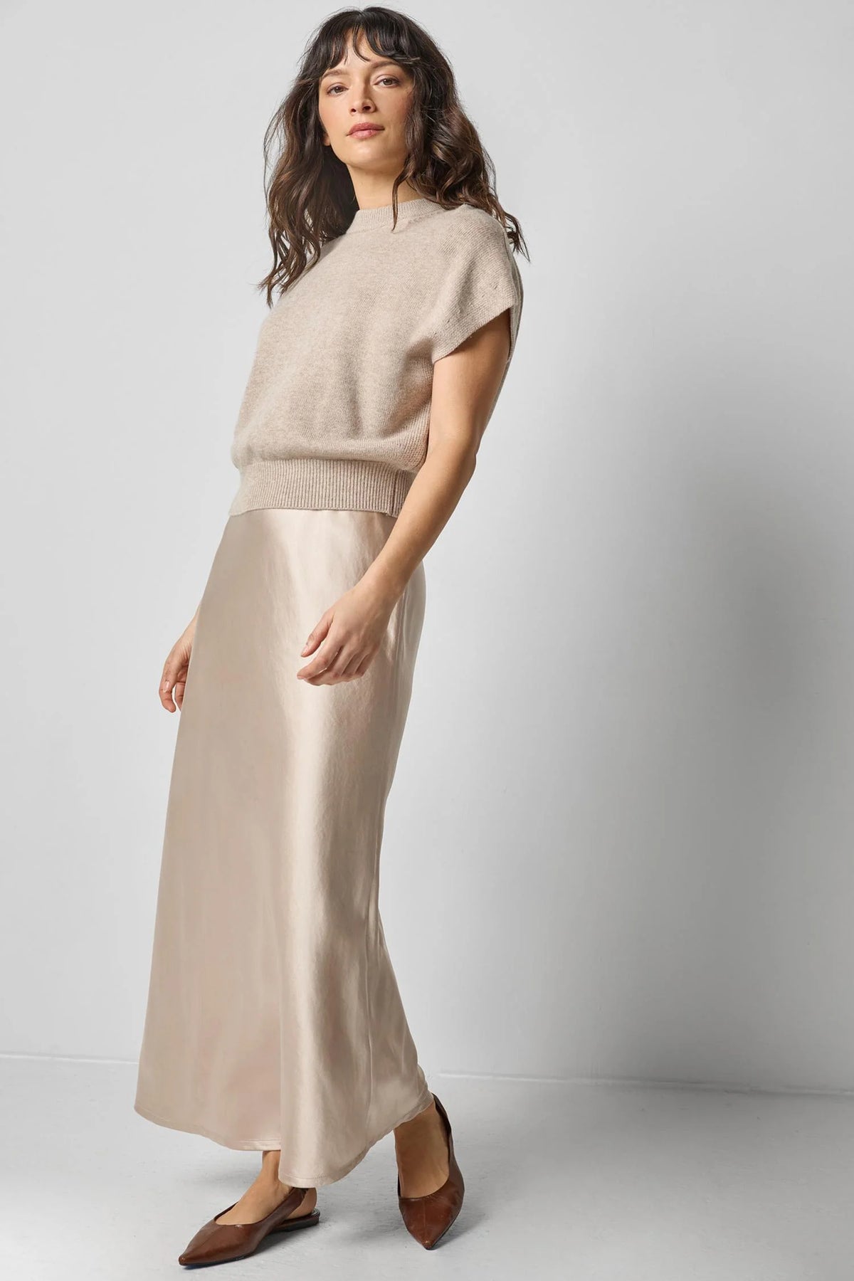 The Satin Slit Front Skirt in satin twill has just the right weight, giving it a fluid drape that feels substantial without being too heavy. Designed with a simple hidden elastic waistband for a smooth, comfortable fit, this bias-cut maxi skirt moves effortlessly with the body. An asymmetrical seam and off-center slit add extra detail to this classic shape. Pair it with a satin top, or style it with a sweater for a modern mix of textures.