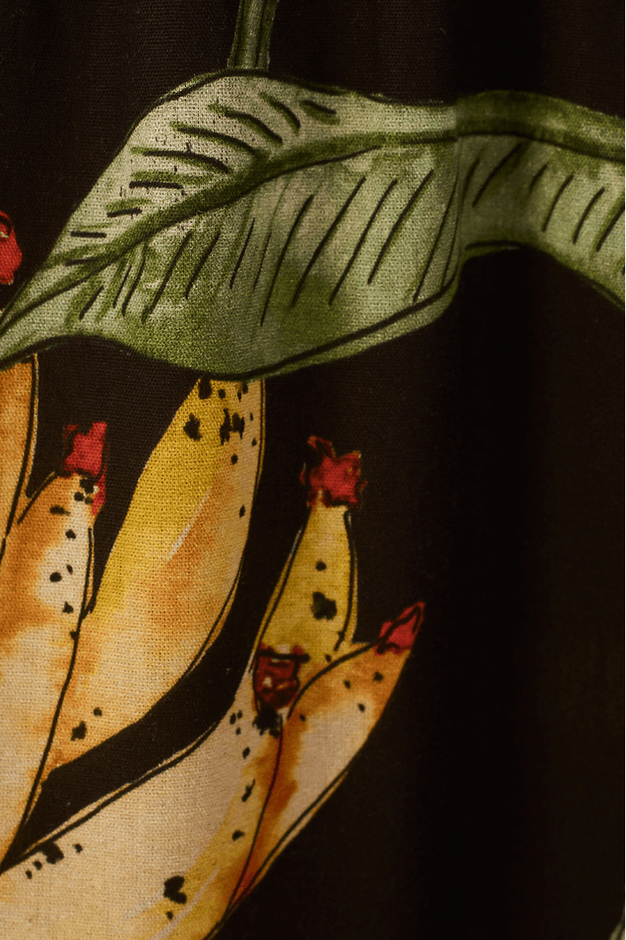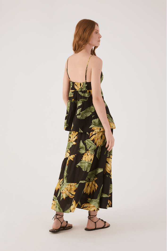 This tiered skirt is crafted from lightweight cotton, ensuring a comfortable fit. The vibrant banana leaf and flower print against a dark backdrop makes a bold statement. A zipper closure ensures a smooth silhouette, perfect for warm days and breezy evenings. Its midi length adds a touch of elegance, easily dressed up or down for any occasion.