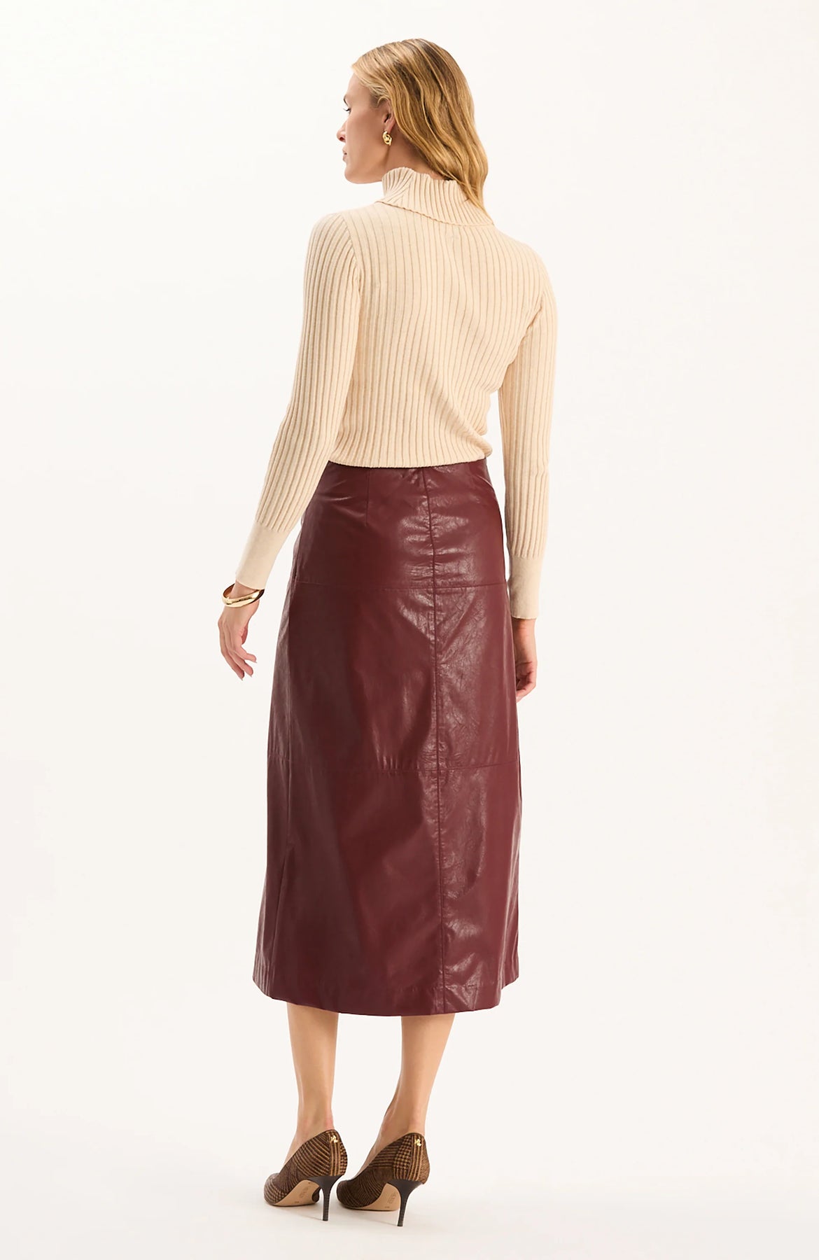The Pheobe Vegan Leather Skirt has a luxurious feel with modern edge. This midi features a sleek, A-line silhouette with front slit detail that adds movement. Perfect with slim turtlenecks, silk blouses, or tailored jackets, it’s a versatile style that transitions seamlessly from day to night.
