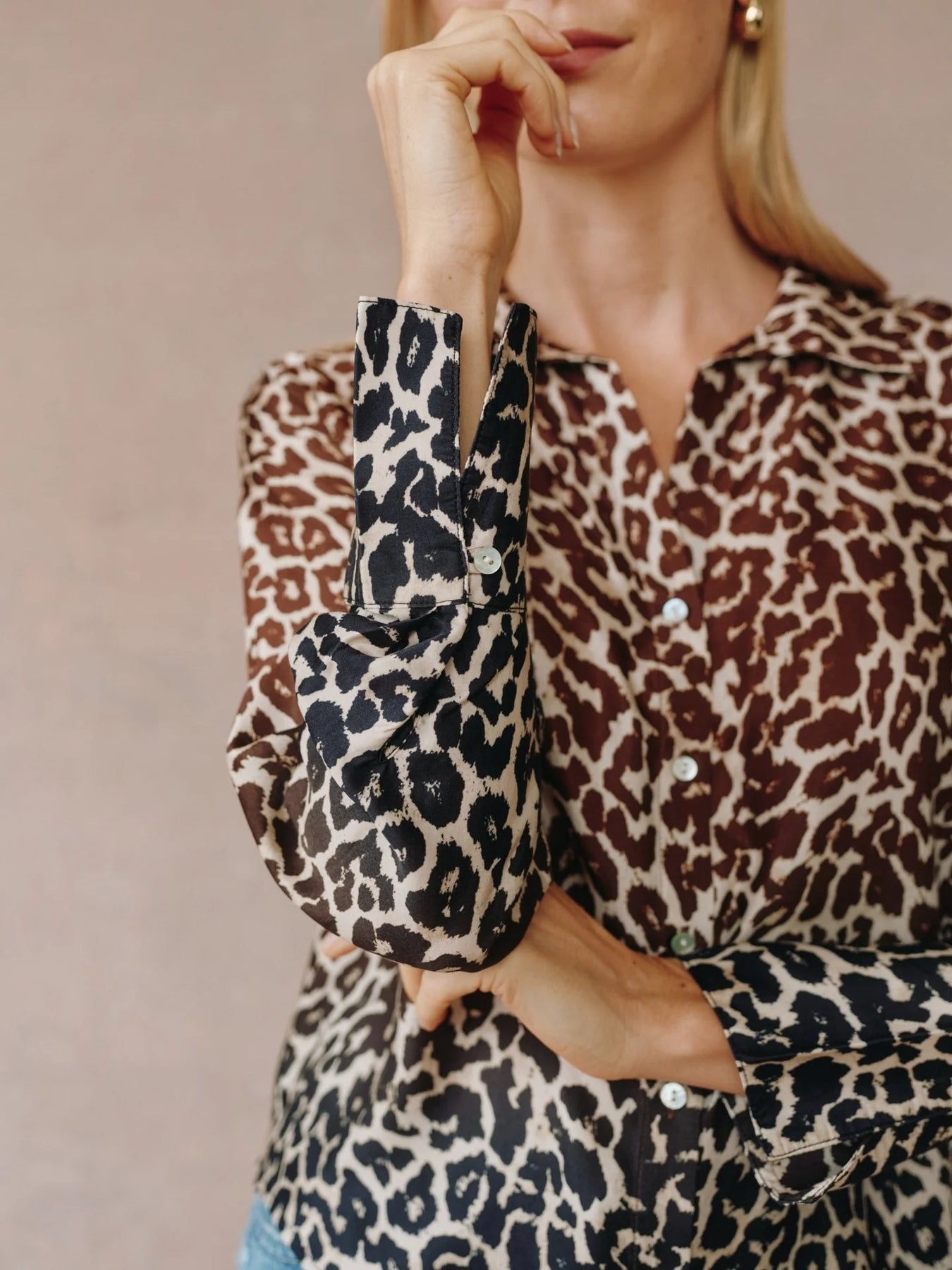 Soft and relaxed, the Flowy Wide Collar Button Down in Ombre Leopard Print is a versatile piece that moves effortlessly from day to night.