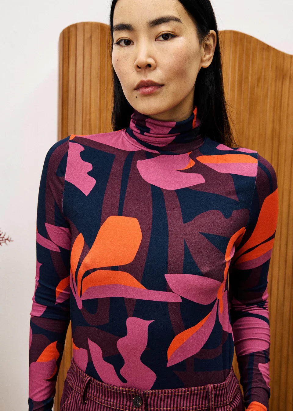 Elevate your wardrobe with the Oregano Geo Flowers Top, featuring a fitted cut and high collar for a sleek silhouette. Crafted from ultra-soft stretch fabric, this long-sleeved turtle neck offers both comfort and style. The bold, colorful print adds a refined statement to your look, making it perfect for sophisticated layering or standout solo wear.