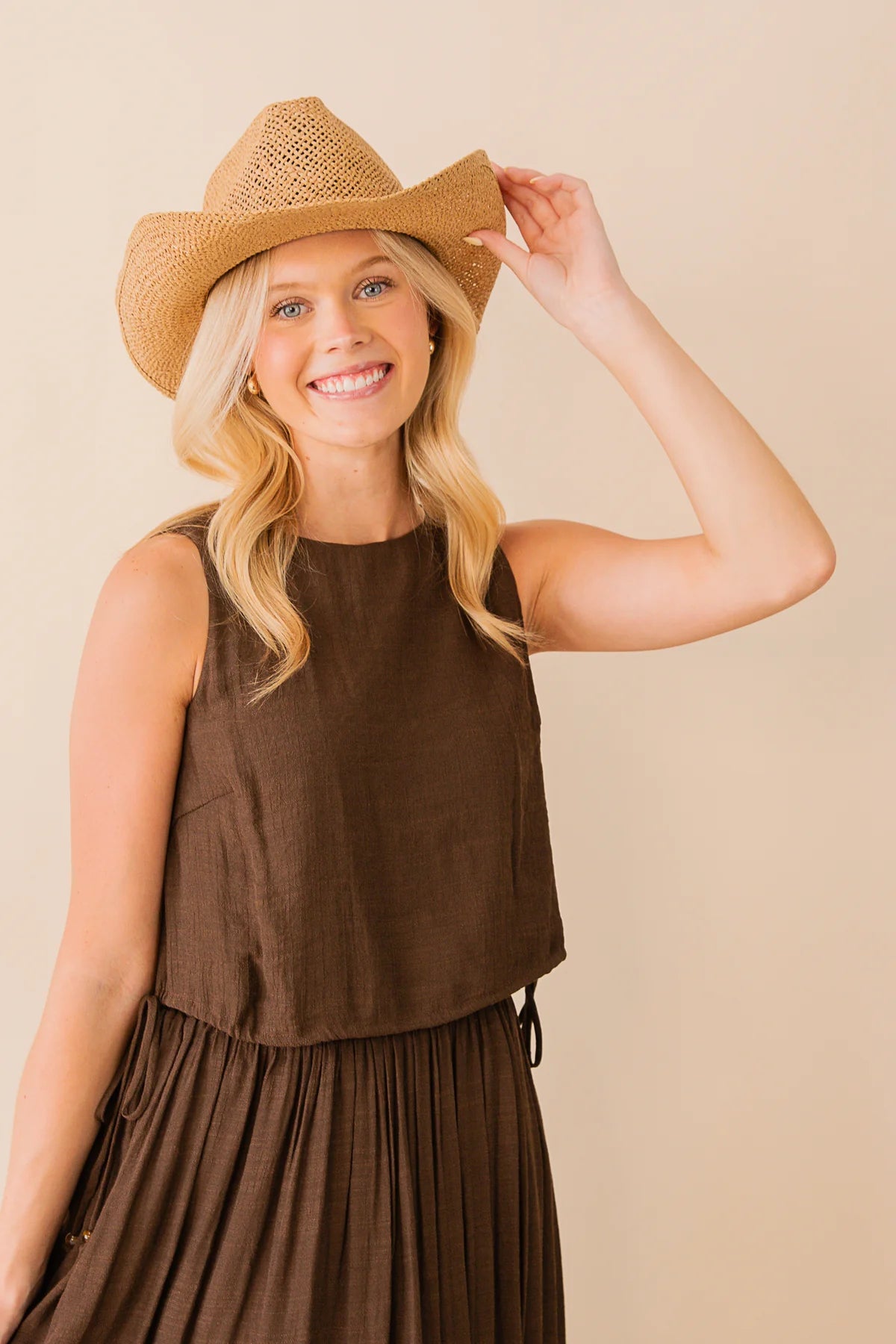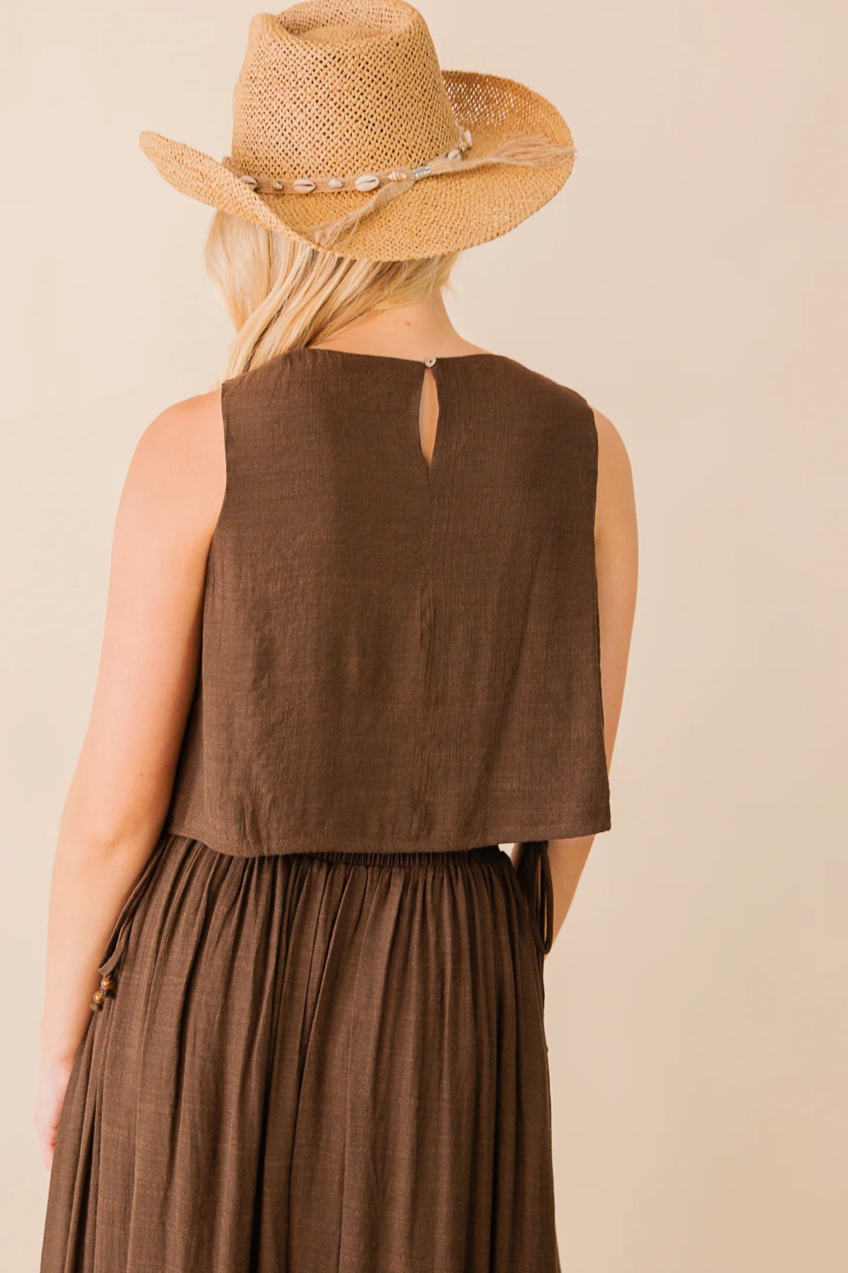 The Marie Side Tie Top in brown offers a flattering fit with its adjustable side ties, allowing you to customize your look and comfort. Its warm brown shade adds a versatile, earthy touch to your wardrobe, perfect for pairing with jeans or skirts.