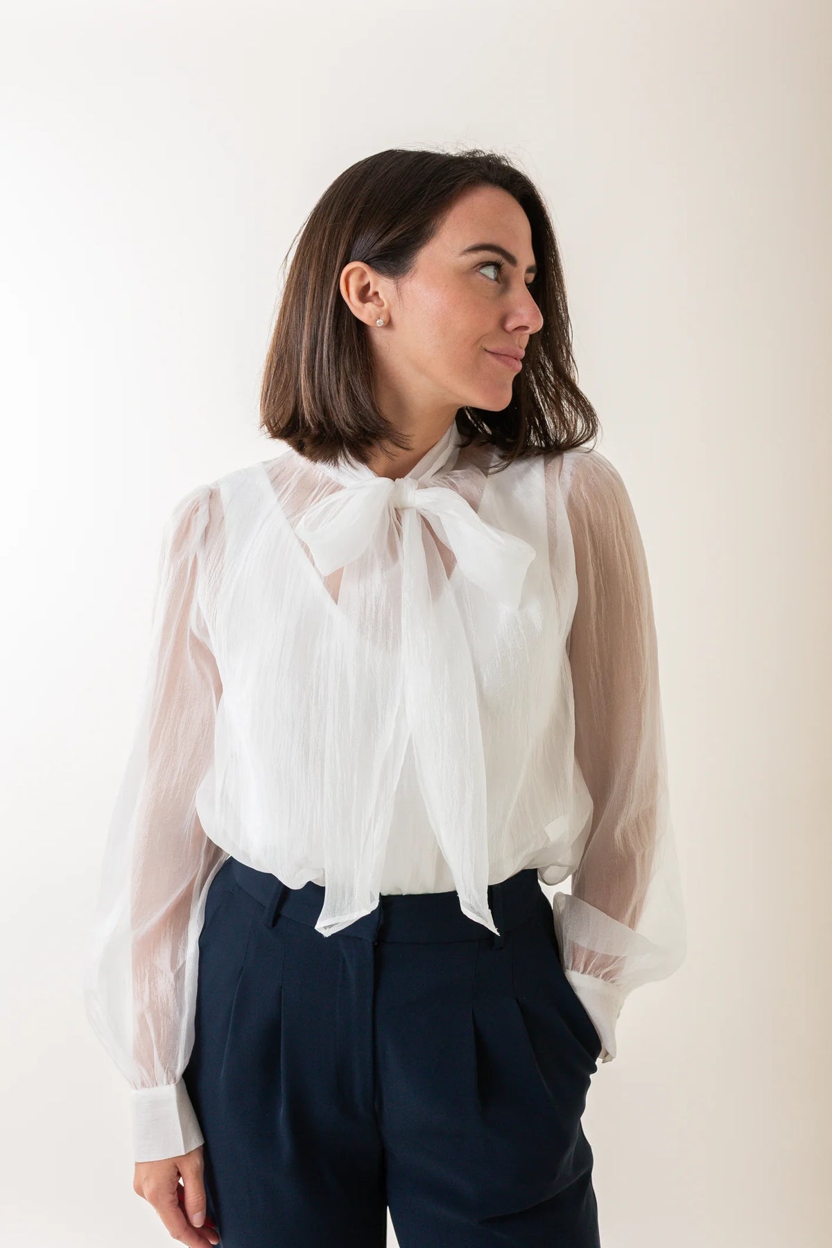 The Natasia Sheer Blouse presents a refined blend of elegance and contemporary style with its high neckline and delicate self-tie detail. Its textured, sheer fabric is complemented by long, cuffed sleeves and a sleek V-neck tank inner layer, providing both sophistication and subtle coverage. Crafted from a nylon and polyester mix with a soft polyester-spandex lining, this blouse ensures comfort and a true-to-size fit. Ideal for polished, elegant occasions, it is also easy to maintain with machine wash and tumble dry care. The model is 5'6" and wears a medium for a relaxed silhouette.