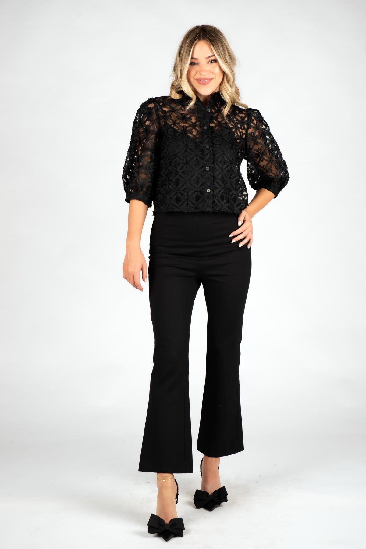 The Eden Top brings understated elegance to your everyday wardrobe. This sophisticated button-up features delicate lace detailing with practical 3/4 sleeves in luxurious black organza. Perfect for the modern professional, it effortlessly transitions from office to evening occasions. The refined silhouette and quality construction make it a versatile essential that pairs beautifully with tailored trousers or skirts for a polished, contemporary look.