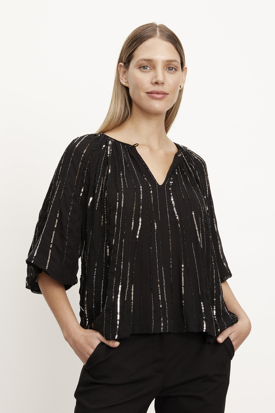 RHINESTONE & PEARL EMBROIDERED KNIT TOP