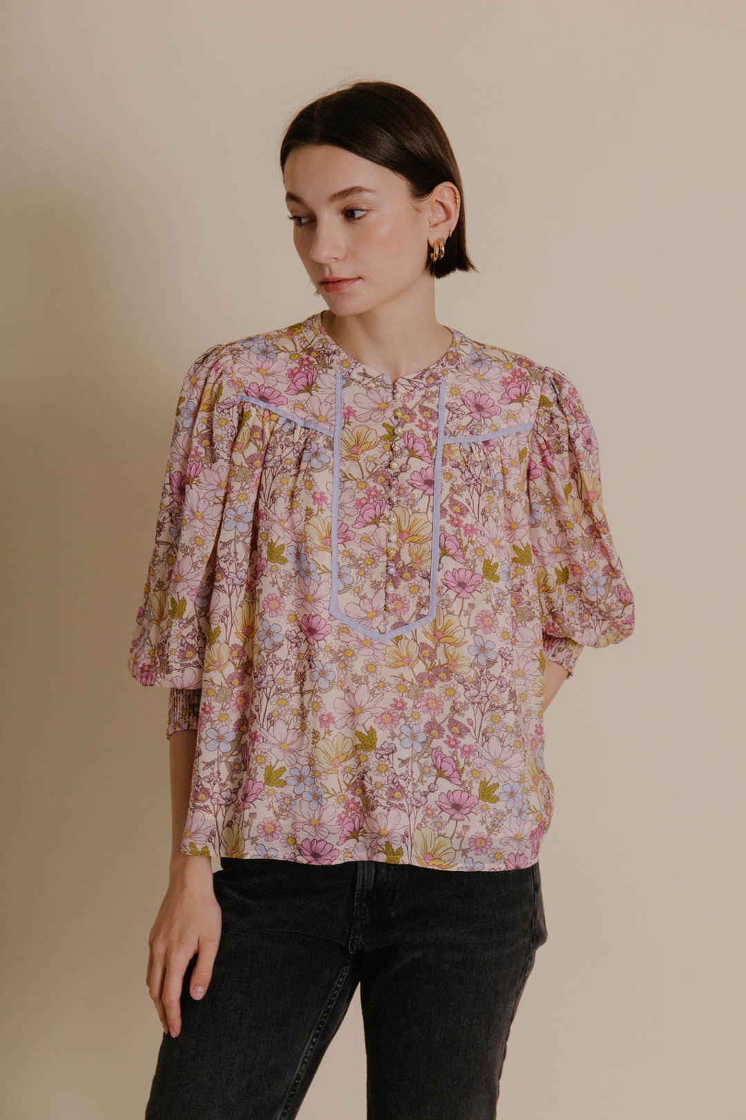 BUBBLE SLEEVE BUTTON DOWN PRINTED COTTON TOP