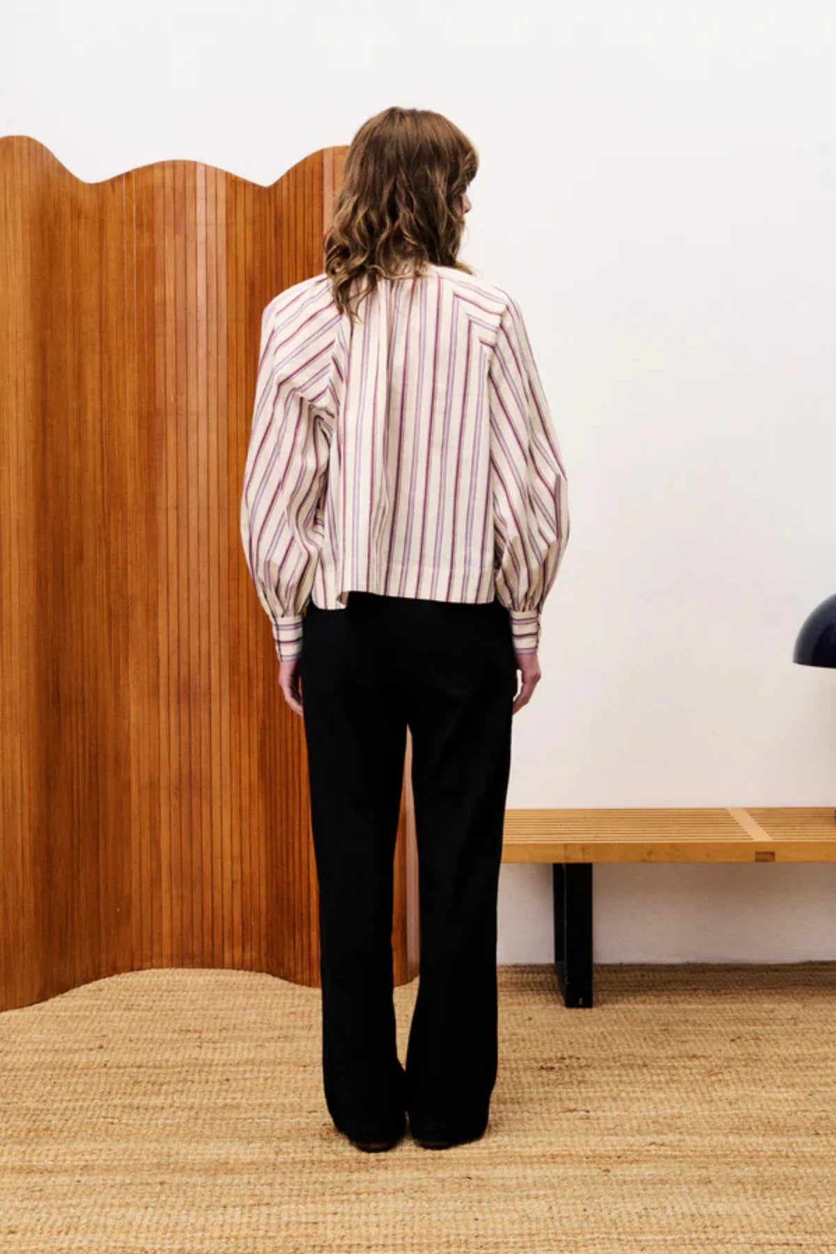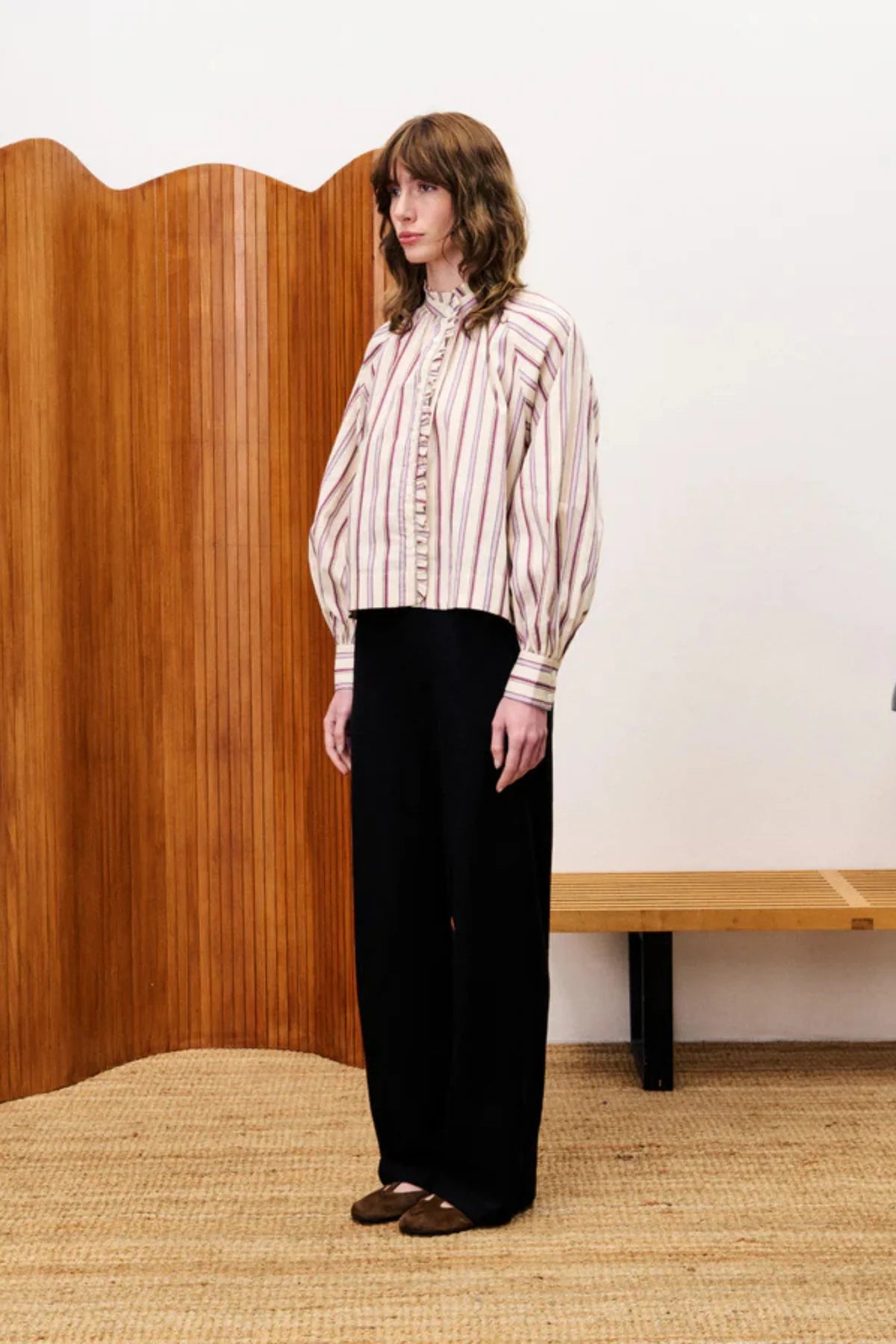 - Stunning hip-length, slightly swingy blouse features a cream ground with lavender and plum stripe pattern, blouson sleeve and ruffle detail up the front plaquette and collar
