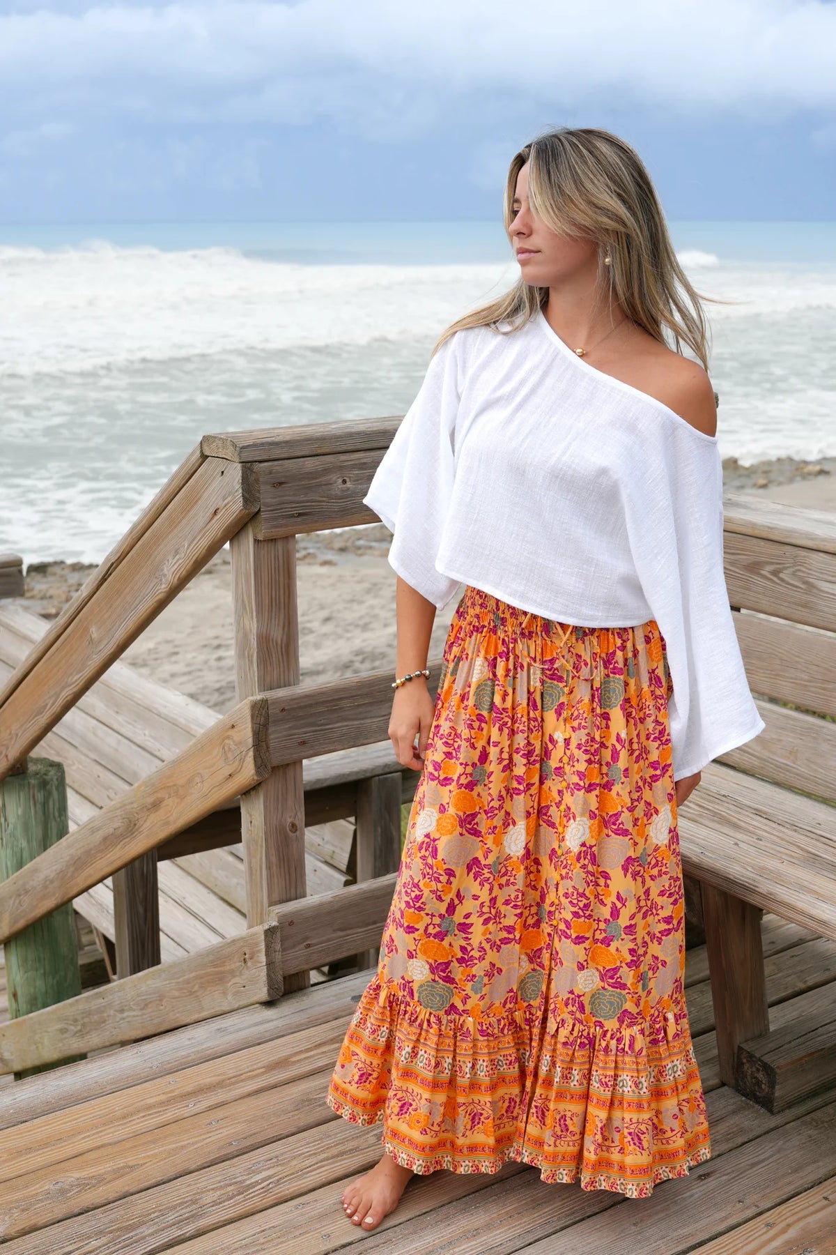 This elegant skirt features an elastic waist with a front tie detail for a tailored fit and a button-down front for classic appeal. Its high-low hemline and ruffle bottom add a sophisticated, feminine flair. Crafted from 100% rayon, it promises lightweight comfort and graceful movement. Designed as one size fits most, this versatile piece pairs beautifully with a variety of tops, perfect for elevating your wardrobe with effortless style.
