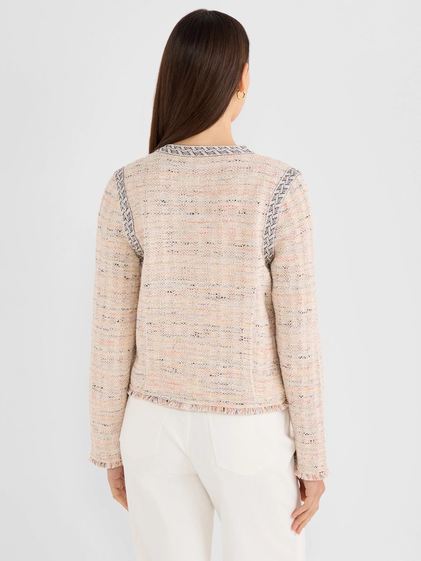 Opposites attract in this Contrast Trim Knit Jacket, where jacquard taping on the front and shoulders creates striking visual interest against a vibrant woven body. Fringe detailing adorns the cuffs and hem for an unexpected finishing touch. Unlined and midweight, this regular-fit style features a V-neck, long sleeves, and hook-and-eye closure. Hip-length cut with functional welt pockets and a 22" length on regular sizes—a refined piece that commands attention.