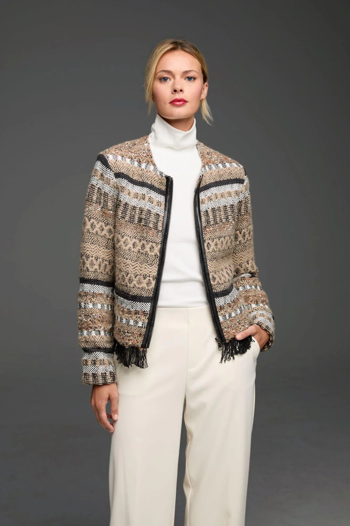 An instant outfit maker. Make a style statement with the Color Weave Knit Jacket, a vibrant piece inspired by vintage patterns. Crafted with a super soft hand feel and a medley of multicolored yarns made to match the rest of the season's styles, plus a woven tape trim and playful pom-pom accents along the edges add unique charm, while sleek hook-and-eye closures add utility to the colorful design.