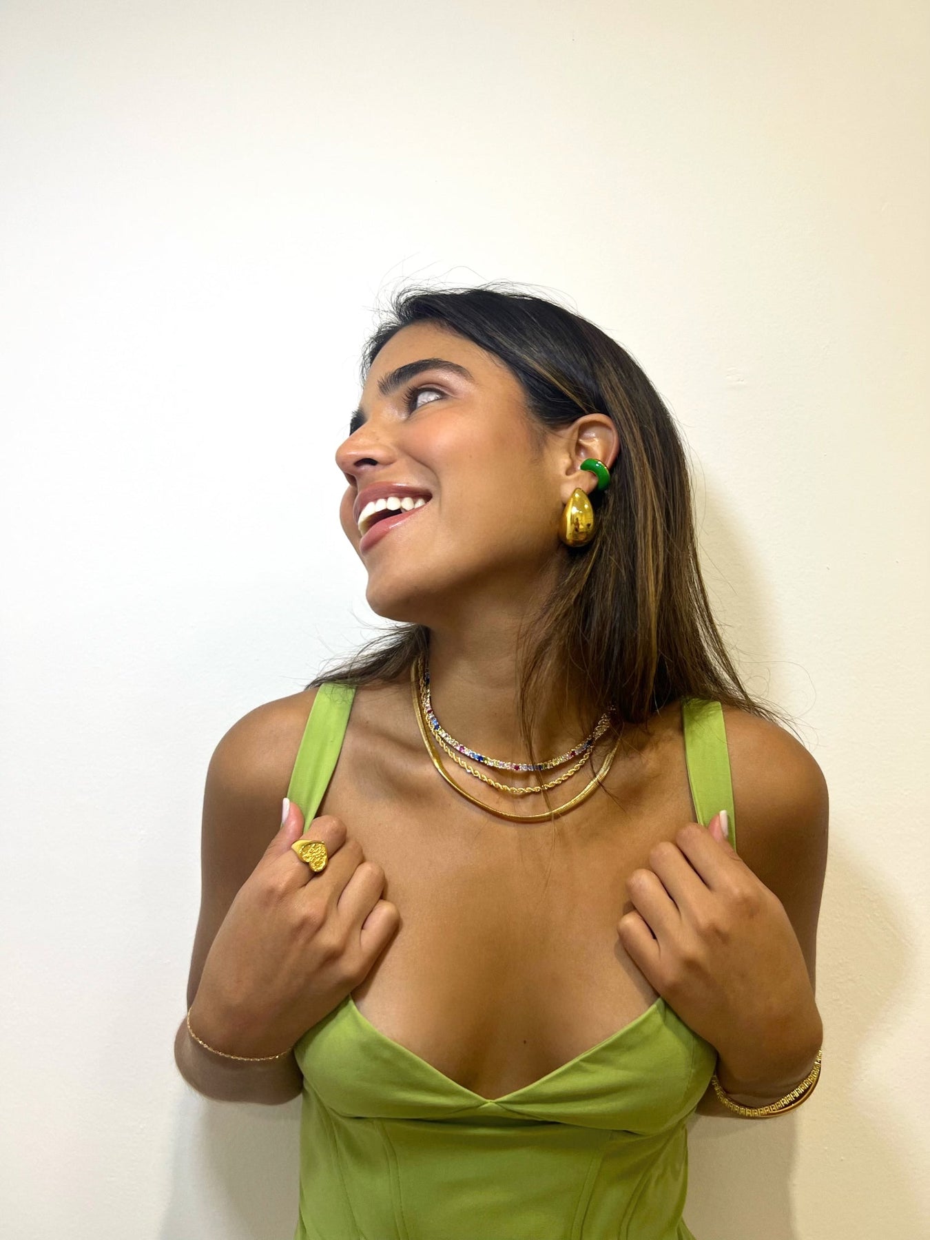 Meet Margot! She is our thicker ear cuff and we are loving the two- tone of the Emerald and Gold.