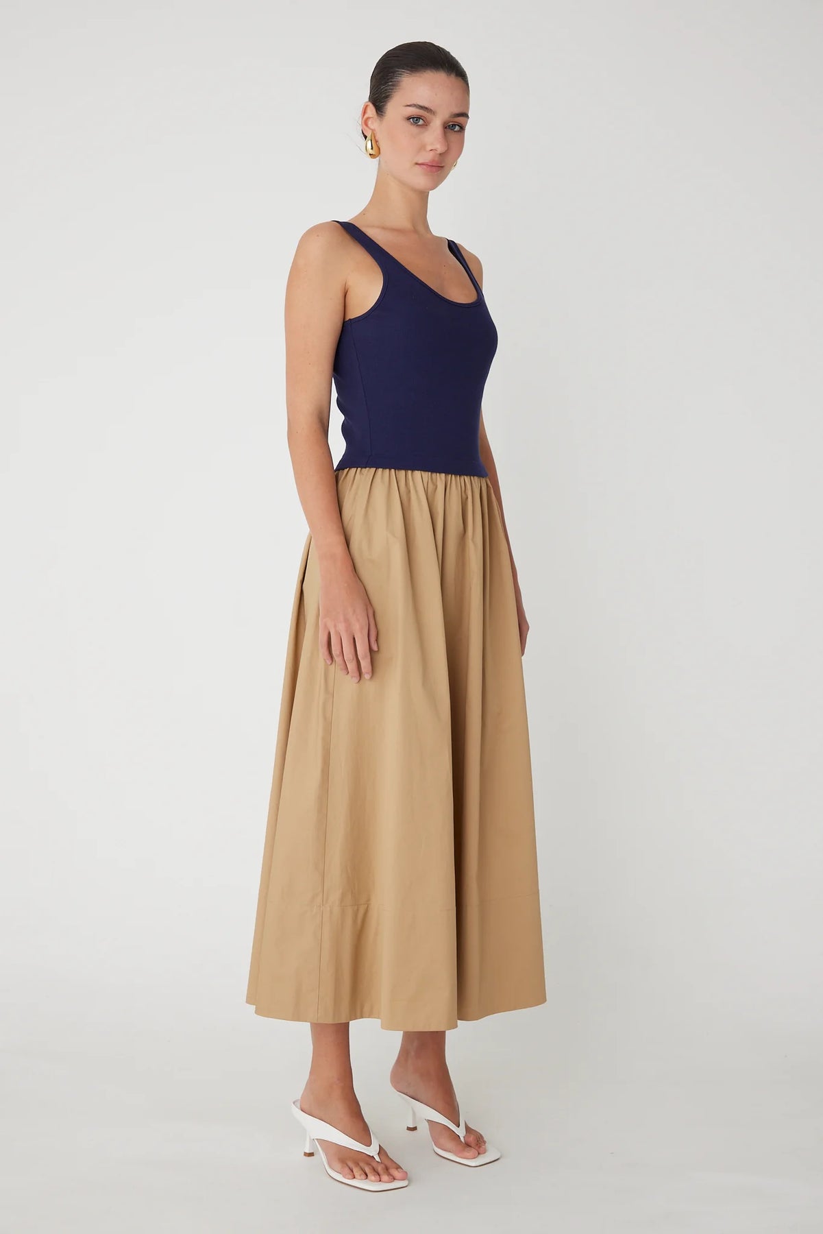 The Gracen dress embodies understated luxury through its thoughtful two-tone construction. A structured navy ribbed tank meets a crisp khaki cotton poplin skirt, creating a harmonious blend of complementary neutrals. The mixed-media silhouette offers refined versatility—equally at home during the workday or evening occasions. Crafted from 100% cotton and unlined for breathability, this tailored piece features practical side pockets and a polished 51-inch length. True to size, it delivers effortless sophistication through intentional design.