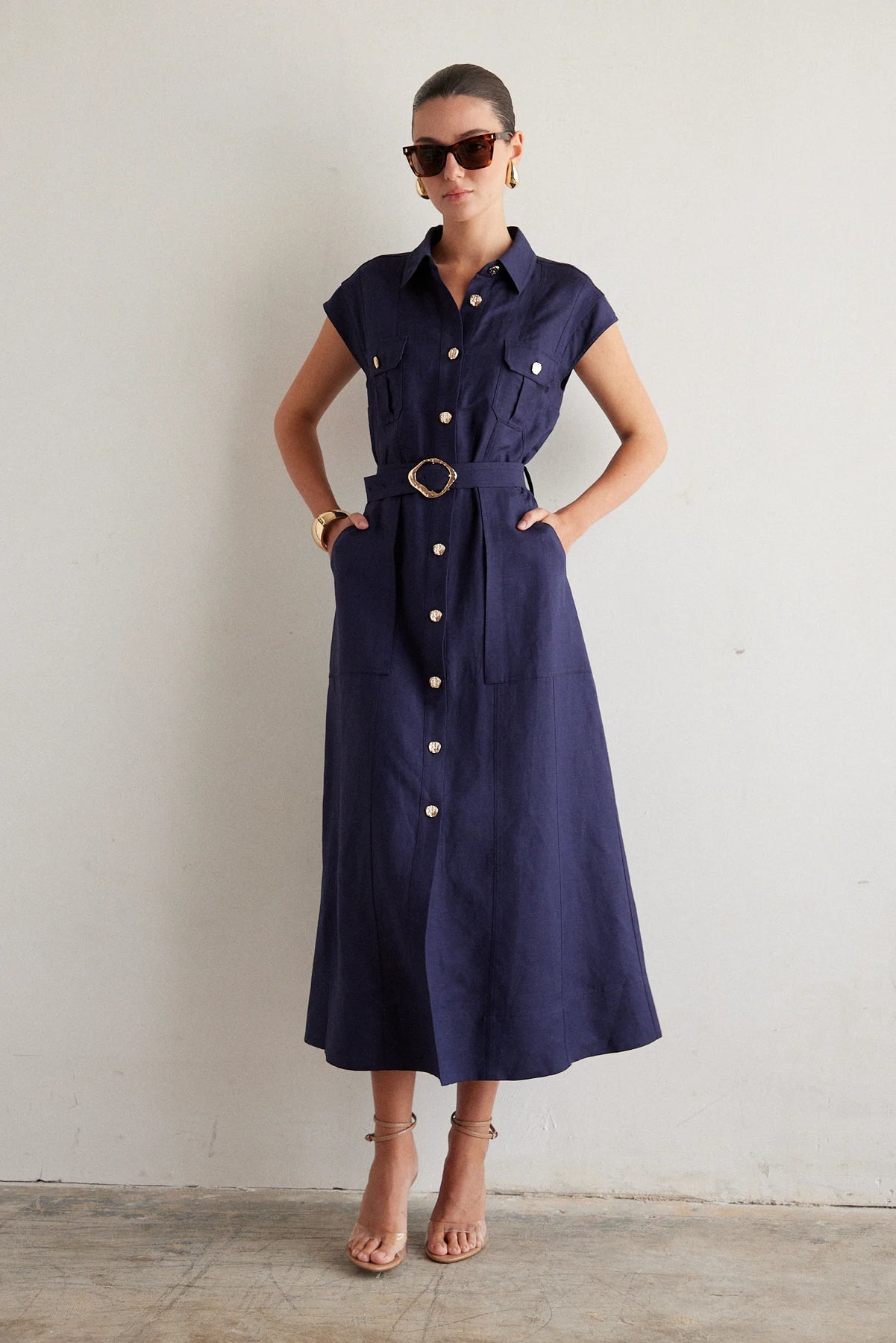 The Helsa dress reimagines the classic shirt dress in sophisticated navy linen-viscose blend. Front button closure, coordinating belt, and polished gold accents create an effortlessly refined aesthetic. Unlined for breathable comfort. True to size; 51" length from shoulder. Perfect for elevated everyday styling or polished occasions.