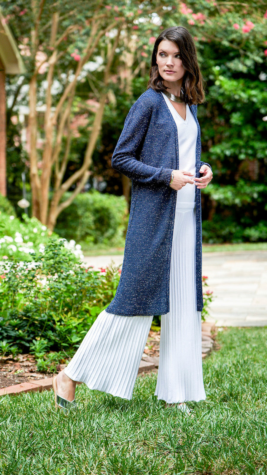 Best Seller: Wide leg wave-knit plisse-look pleated pants with a wide flat-knit panel at waist and an elastic waist band; Full length; Viscose blend; Sustainable yarn