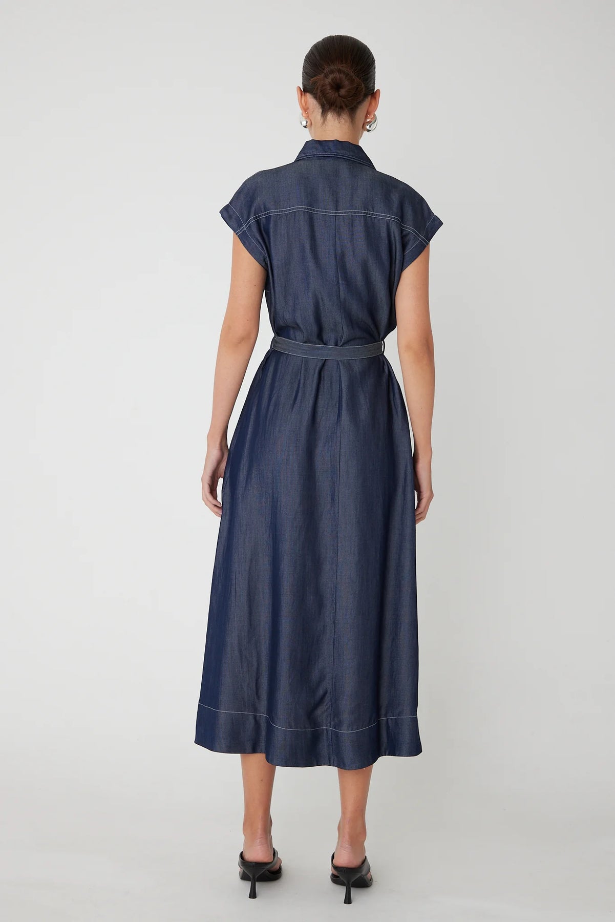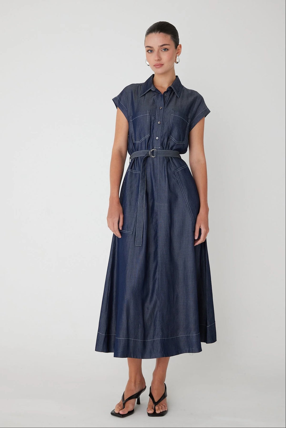 The Kenna dress epitomizes refined simplicity with its premium Lyocell construction that drapes with fluid elegance and delivers a whisper-soft touch. This timeless shirt dress silhouette transitions seamlessly from boardroom to weekend, offering understated sophistication for any moment. Crafted from 100% Lyocell with white contrast stitching, an attached belt, functional side pockets, and an unlined cut, it's a versatile wardrobe essential that feels as luxurious as it looks. Length: 50 inches from shoulder to hem.