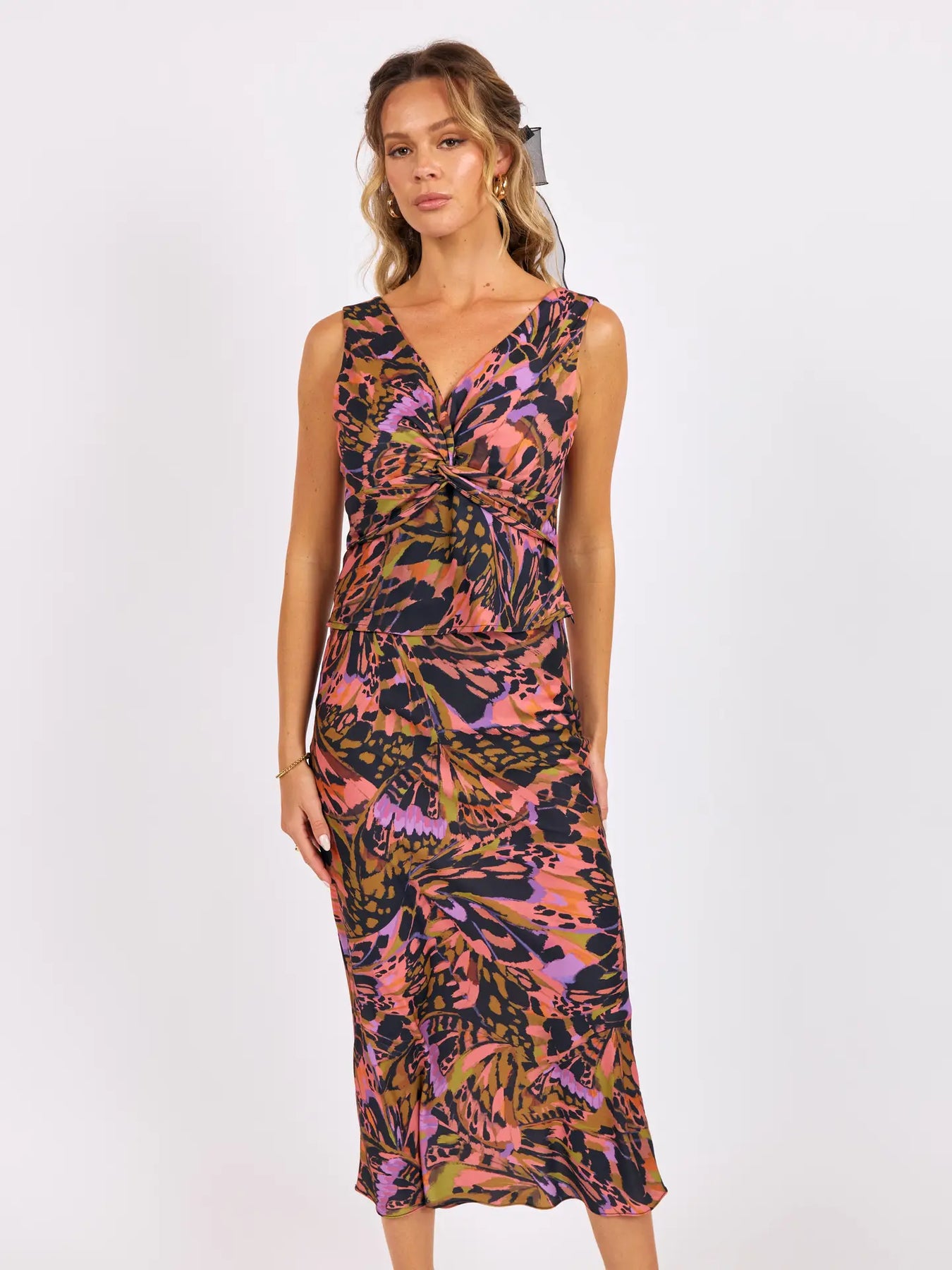 Crafted from 100% polyester, the Butterfly Kiss Bias Midi Skirt offers a silky, flowy silhouette that drapes elegantly. Featuring a vibrant, colorful print, this chic skirt blends comfort and style effortlessly. Designed for a modern fit, it complements any wardrobe with a touch of sophistication. Model is 5'7" and wears a size Small.