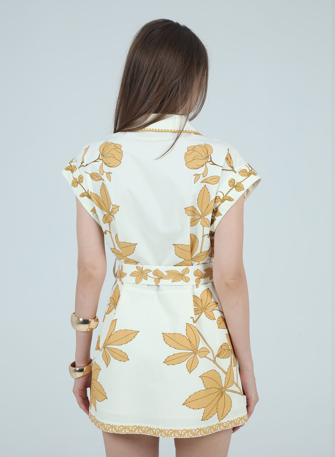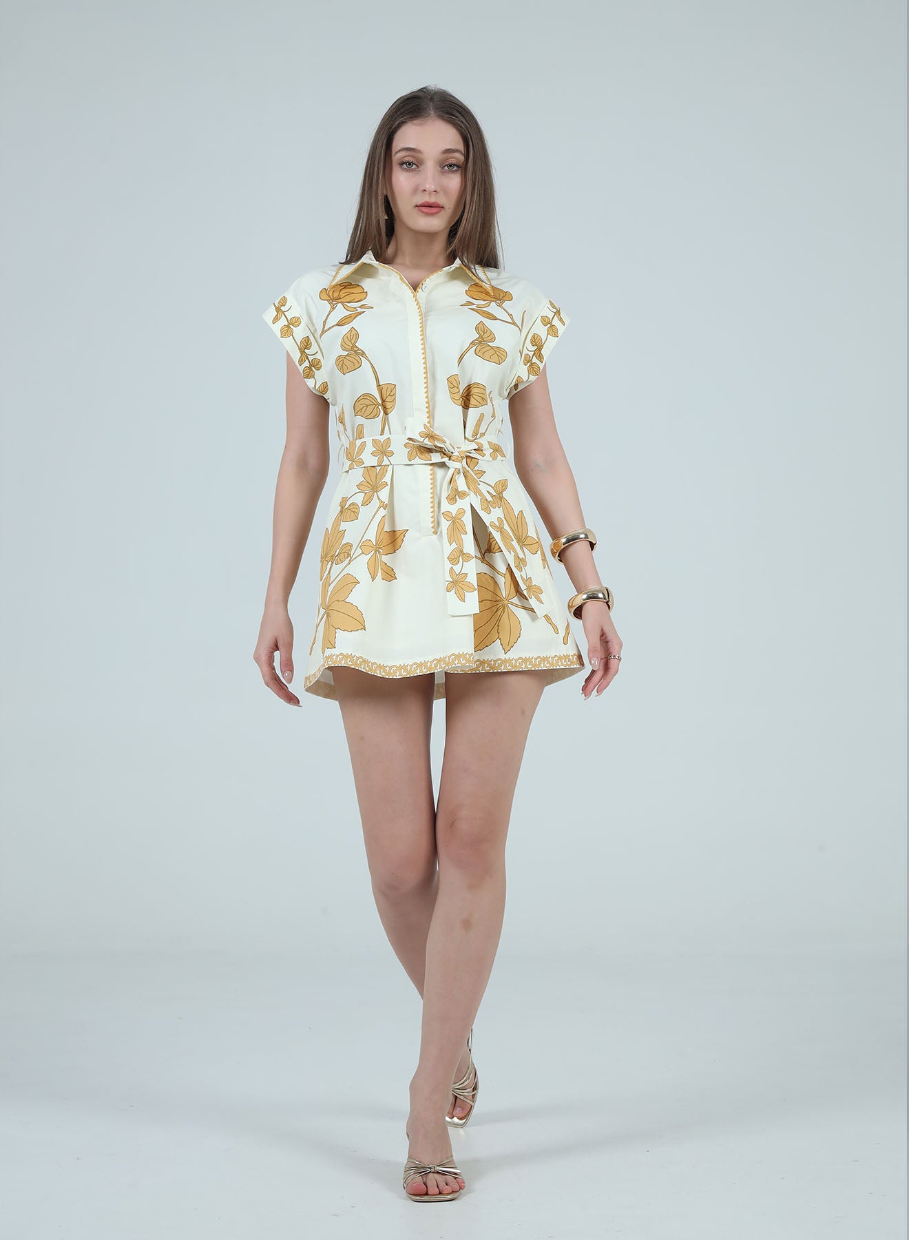 Effortless elegance meets playful charm in this printed A-line shirt dress. Featuring a crisp collar, cap sleeves, and front button closure, it transitions seamlessly from day to evening. The tie waist belt defines your silhouette while the vibrant leaf print adds visual interest. A mini length keeps the look fresh and modern—perfect for brunch, casual outings, or layered styling. Versatile, flattering, and undeniably cute.