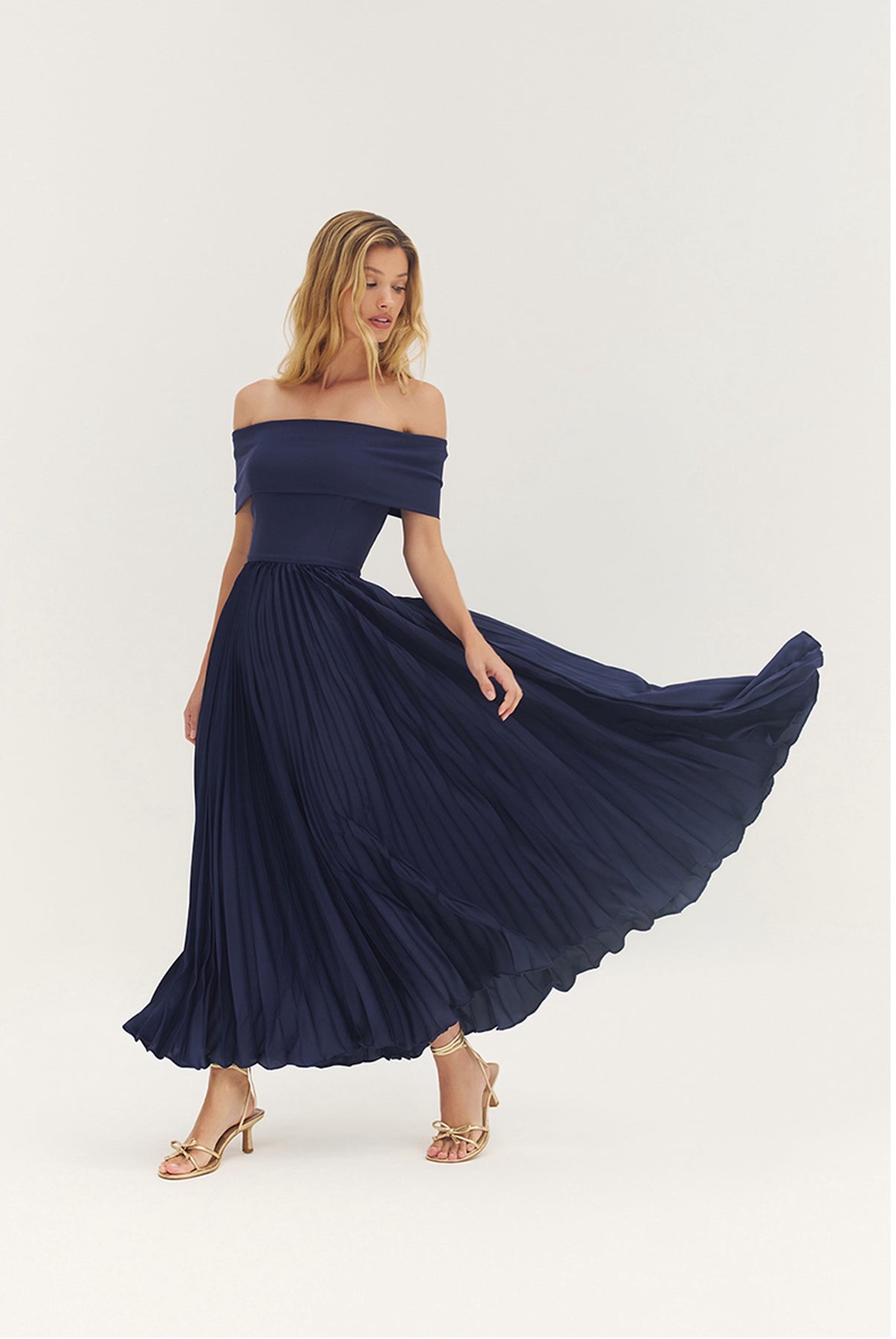The STOCKTON DRESS combines elegance with practical design. This off-the-shoulder midi features a graceful pleated silhouette in stretch crepe satin that moves beautifully. An inner grip prevents unwanted slipping, while the center back zipper ensures an effortless fit. Fully lined for comfort and available in standard and plus sizes. Dry clean only. Perfect for evening events and special occasions where refined style matters.