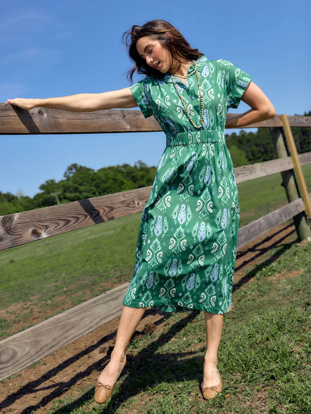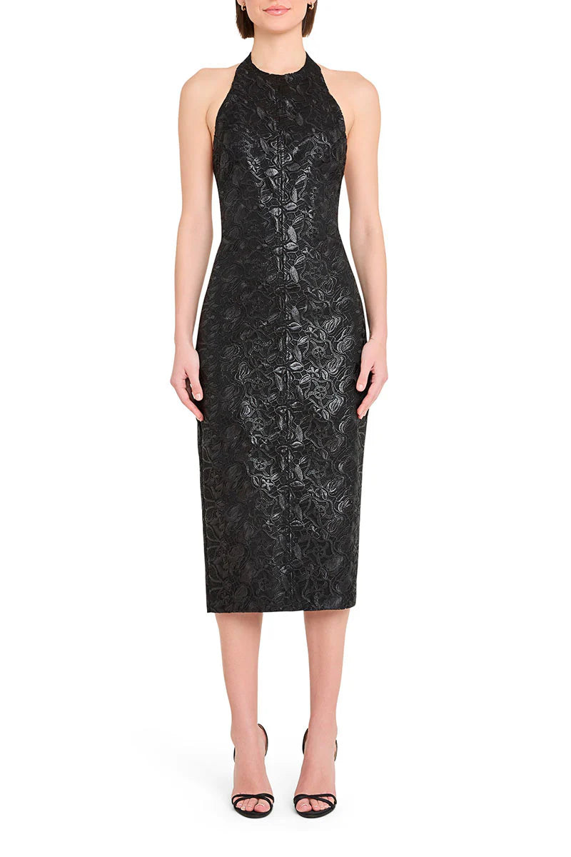 FLORAL JACQUARD FRONT ZIP CLOSURE V-NECK DRESS