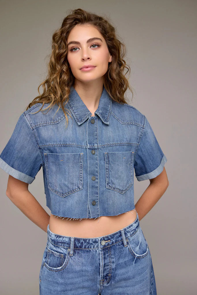 PEARL BUTTON MIXED MEDIA COLLARED KNIT TOP