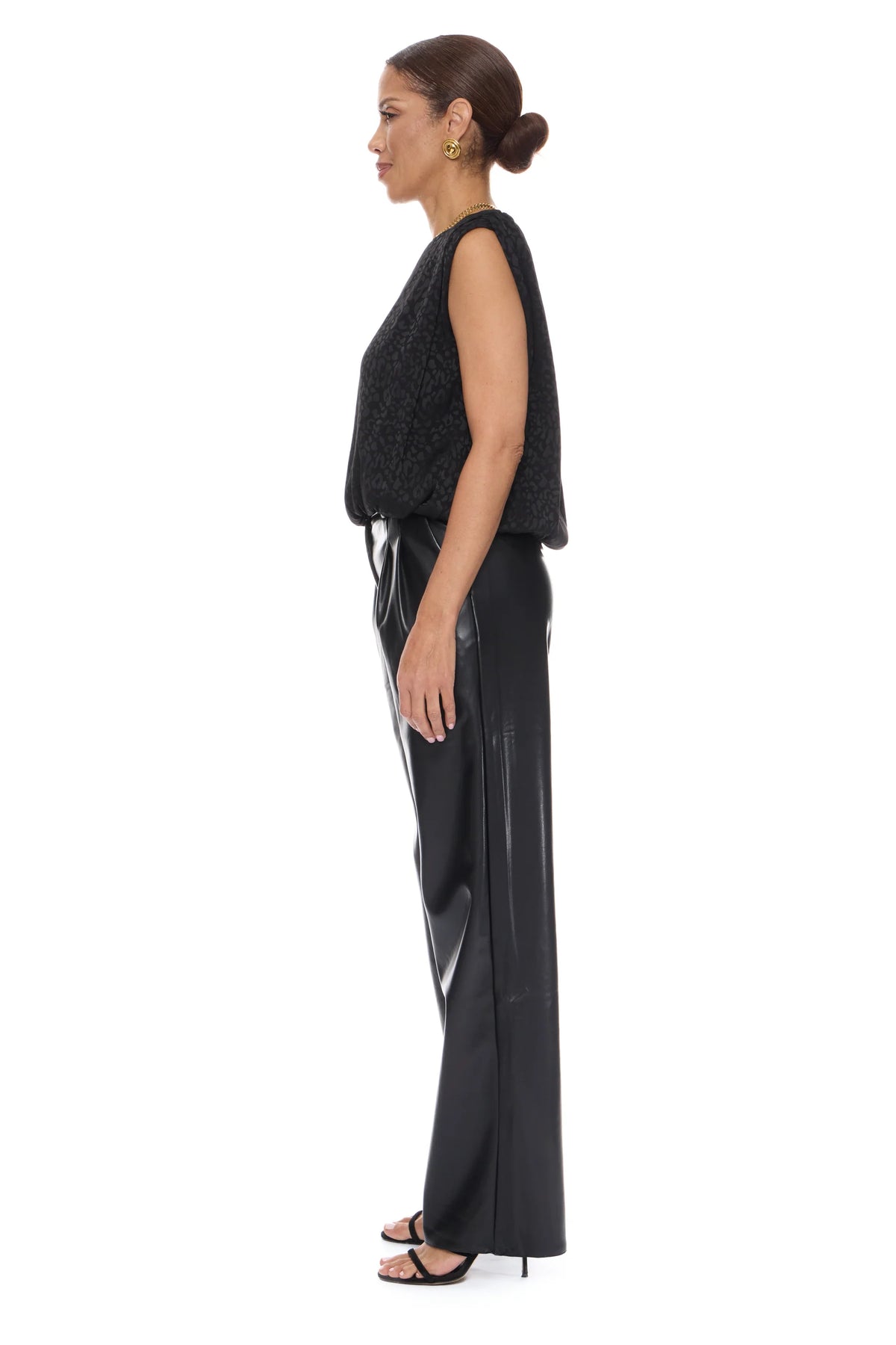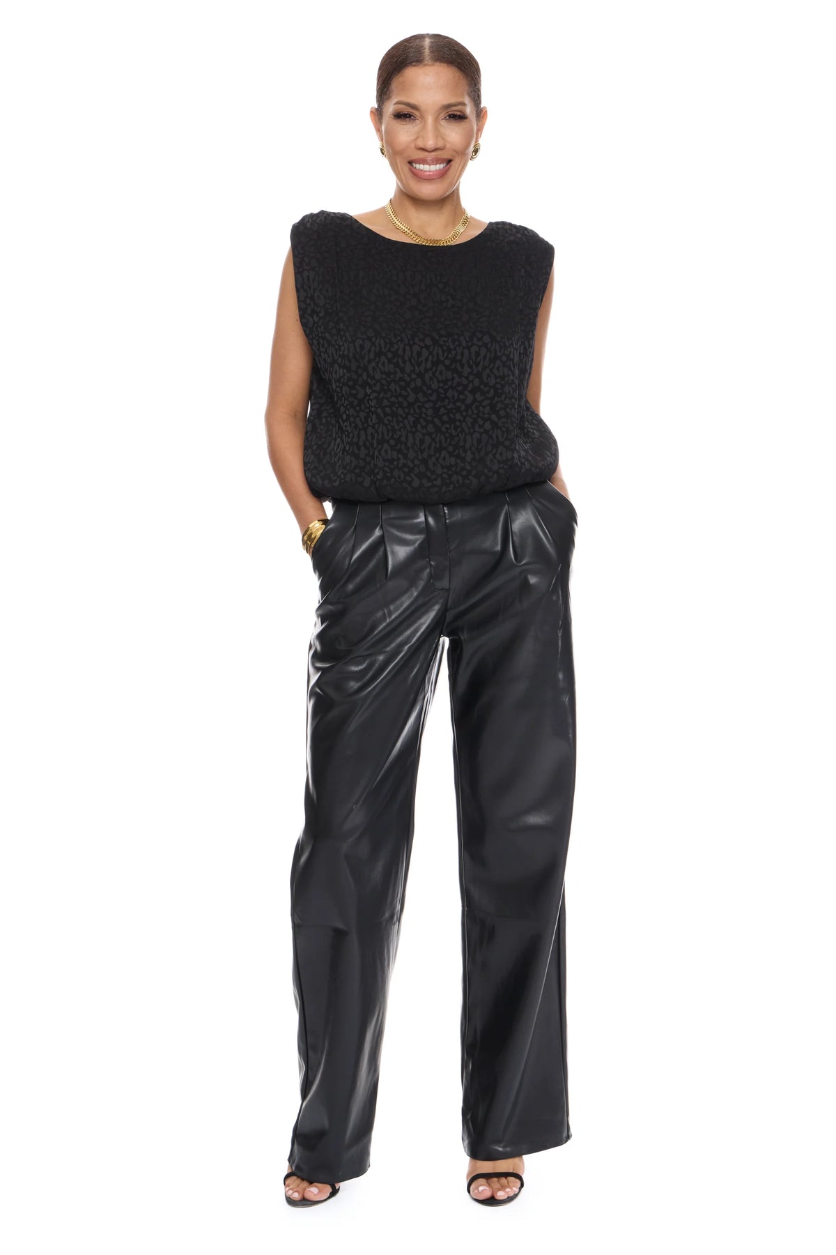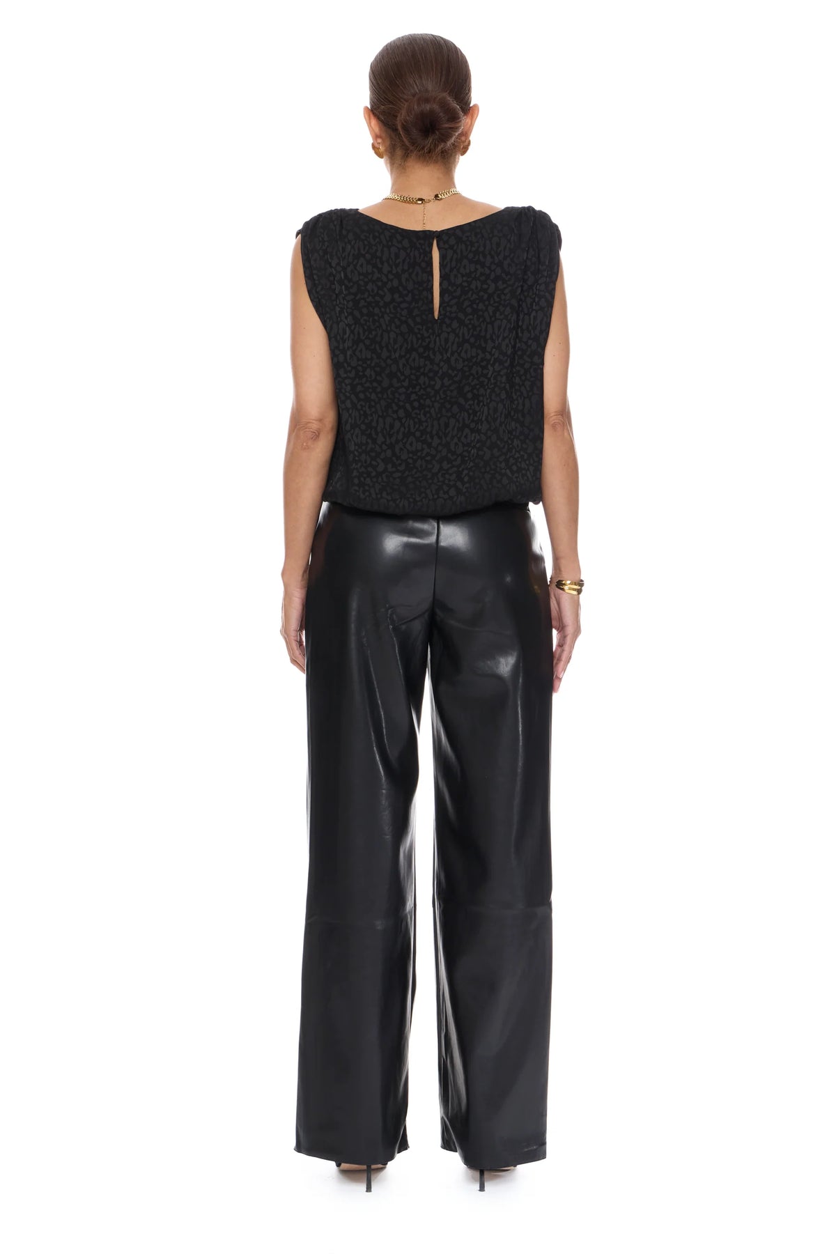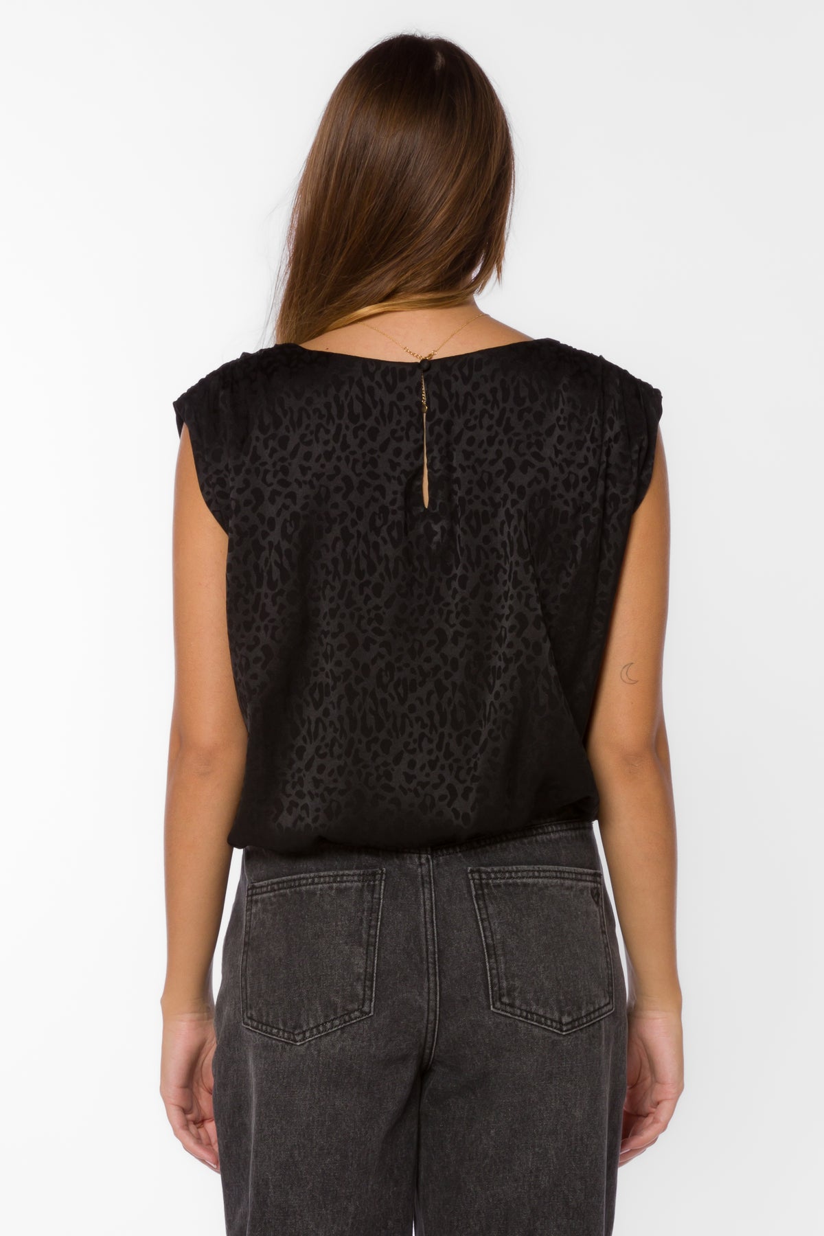 Introducing APOLLO- the perfect blend of sophistication and style. This sleeveless pop over top features delicate shirred shoulder details and a gathered hem, elevating your look effortlessly. Made with 100% polyester, it's not only luxurious but also easy to maintain with a simple cold machine wash. Available in our exclusive Black Leopard Jacquard, it's a must-have for any fashion-forward wardrobe.