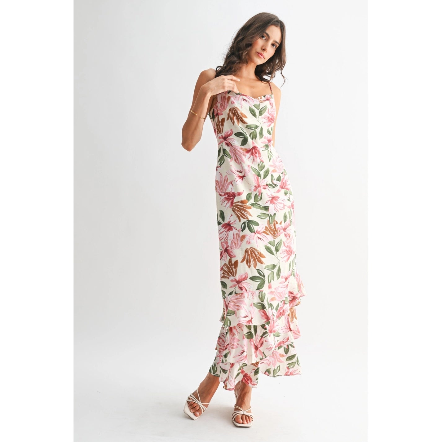 Elevate your wardrobe with this sophisticated tiered maxi dress, where timeless floral design meets contemporary silhouette. The layered construction adds dimension and movement, while the flowing fabric drapes beautifully for an effortlessly polished look. Perfect for weddings, garden parties, or elevated everyday wear, this piece transitions seamlessly from season to season. A versatile investment that pairs with minimal accessories for maximum impact.